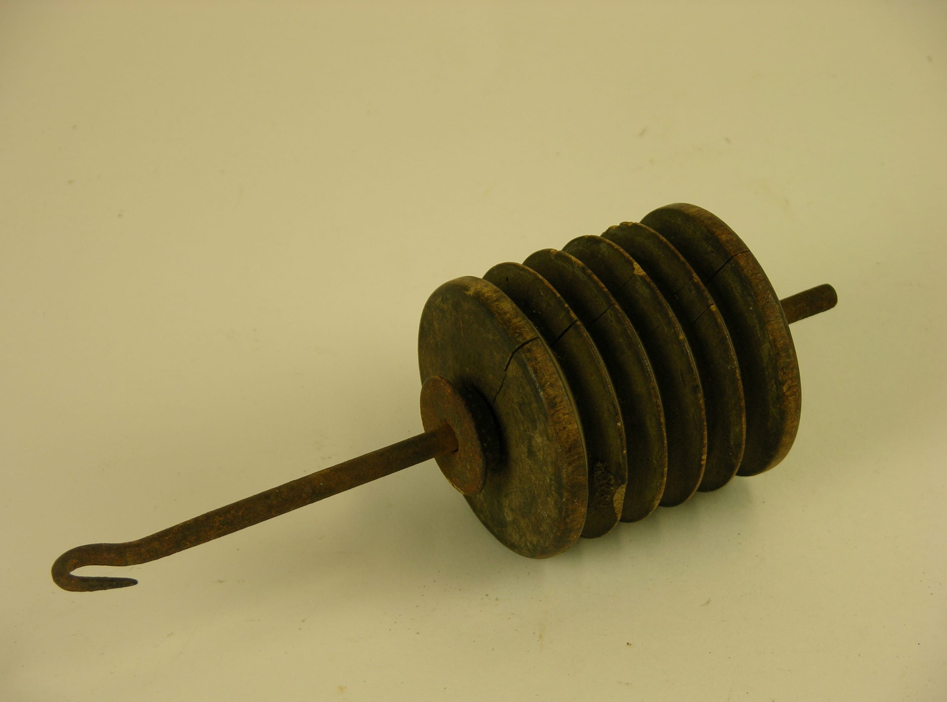 Draadspoel van een weefgetouw; gedraaide houten klos met een ijzeren pin erdoorheen en aan één uiteinde eindigend in een ijzeren lus. Over de inkepingen van de klos wordt draad gewonden