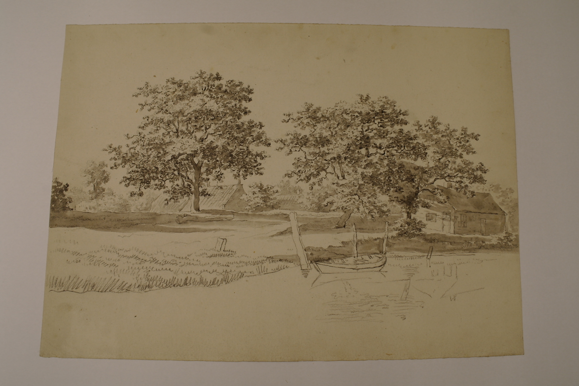 Huis aan een slootkant. Op de voorgrond een roeibootje