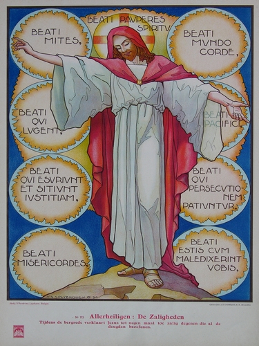 Schoolplaat: No 112 Allerheiligen: de Zaligheden (afbeelding van de Bergrede). Gesigneerd, gemonogrammeerd (met monogramteken) en gedateerd in voorstelling l.o..: Jos. Speybrouck 34, onder voorstelling r.o.: Chromolith. J.L. Goffart SA Bruxelles, l.o. logo van Liturgisch Apostolaat Uit de reeks 'Liturgisch apostolaat'