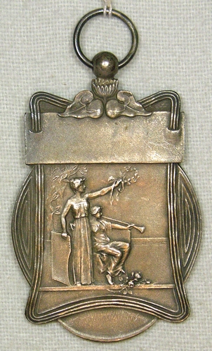 Prijspenning handboogvereniging - 1928, metaal/gebronsd, 70 x 34 x 1 mm, vz.: een staande klassieke vrouwfiguur met lauwerkrans en onbeschreven titulus, een zittende klassieke vrouwfiguur met blaasinstrument aan de mond, de cirkelvorm wordt doorbroken door een cartouche, die bovenaan een 'lege' horizontale band(erole) heeft, kz. opschrift ´wisselprijs E.B.H. 1928´, Jugendstil-elementen, met doorboord knopje en bevestigingsringetje.