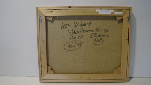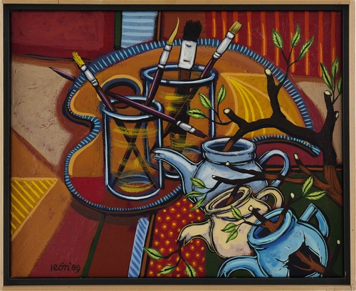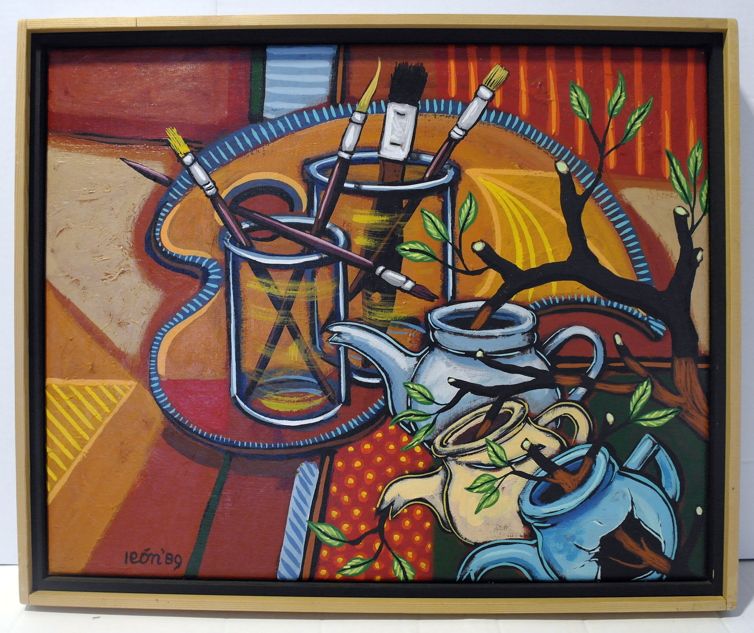 Zonder titel (Stilleven met kwasten in glazen potten, schilderspalet en door koffiepotten heengroeiende takken) - 1989, acrylverf/doek, 40 x 50 cm, gesigneerd en gedateerd l.o.: león ‘89