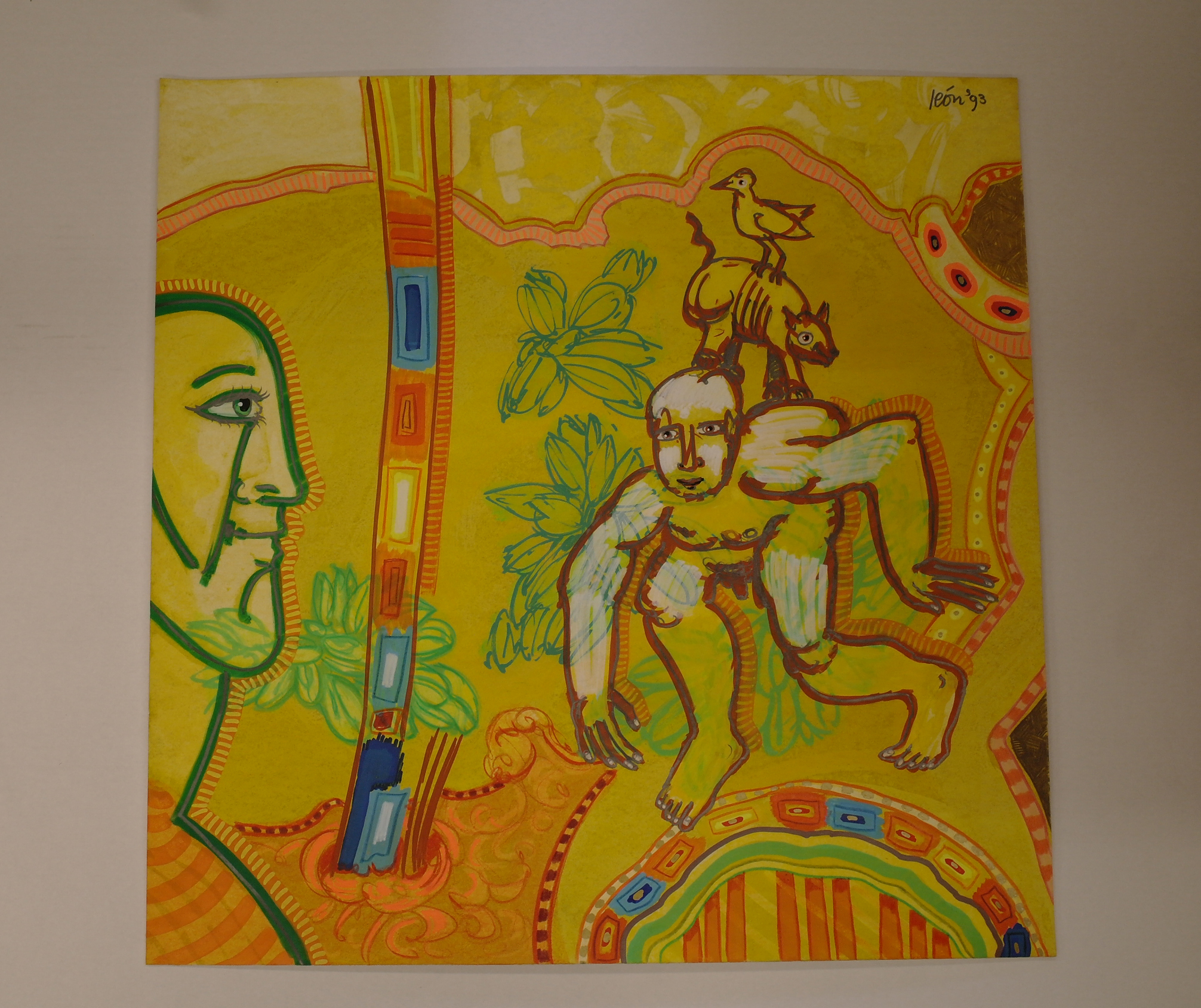 Zonder titel (Compositie met gebukt lopend mannelijk naakt met varken en vogel op de rug en manshoofd en profil) - 1993, gemengde techniek/papier, 50 x 50 cm, gesigneerd en gedateerd r.b.: león ’93