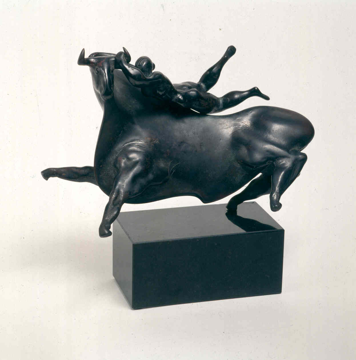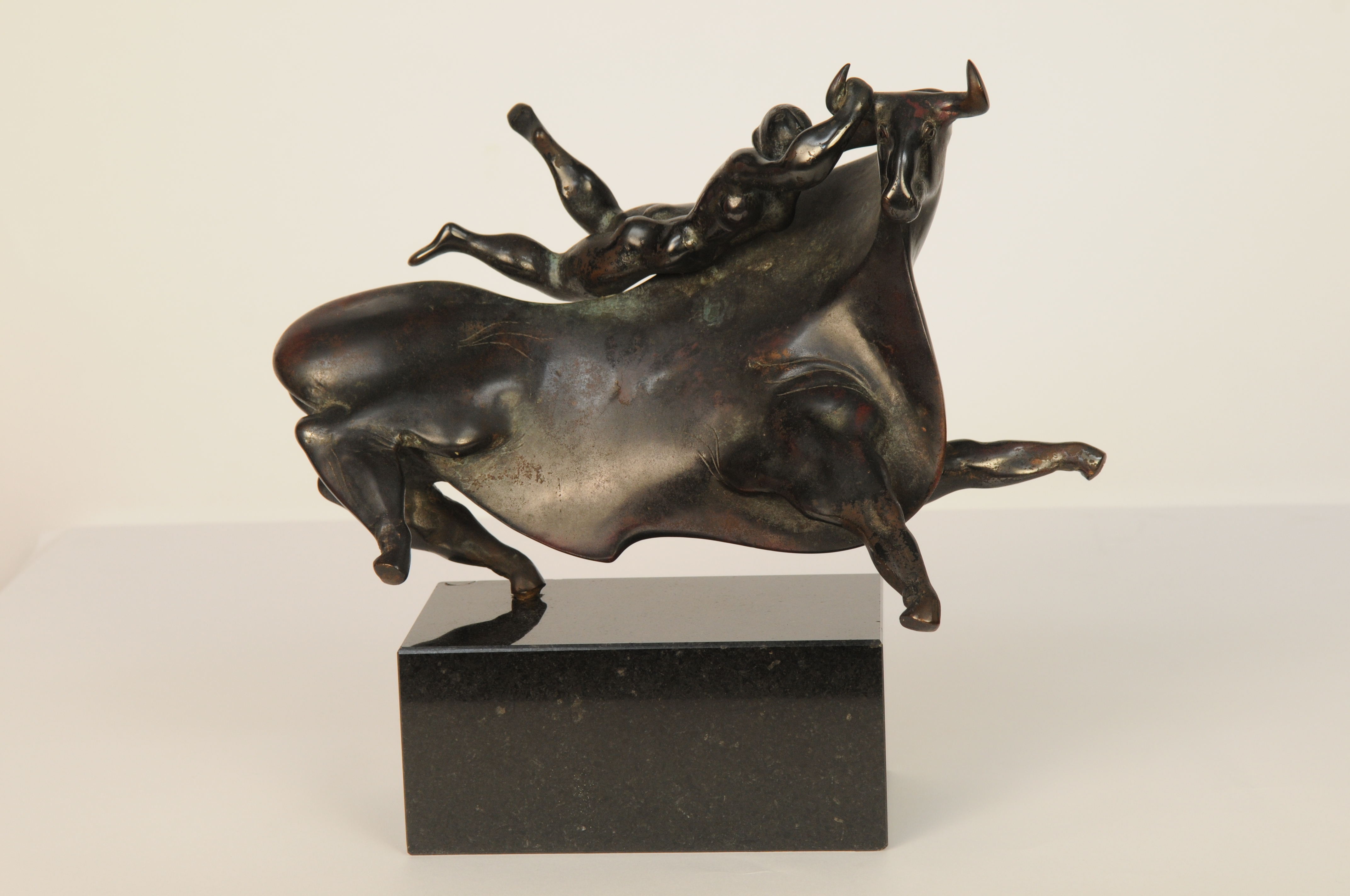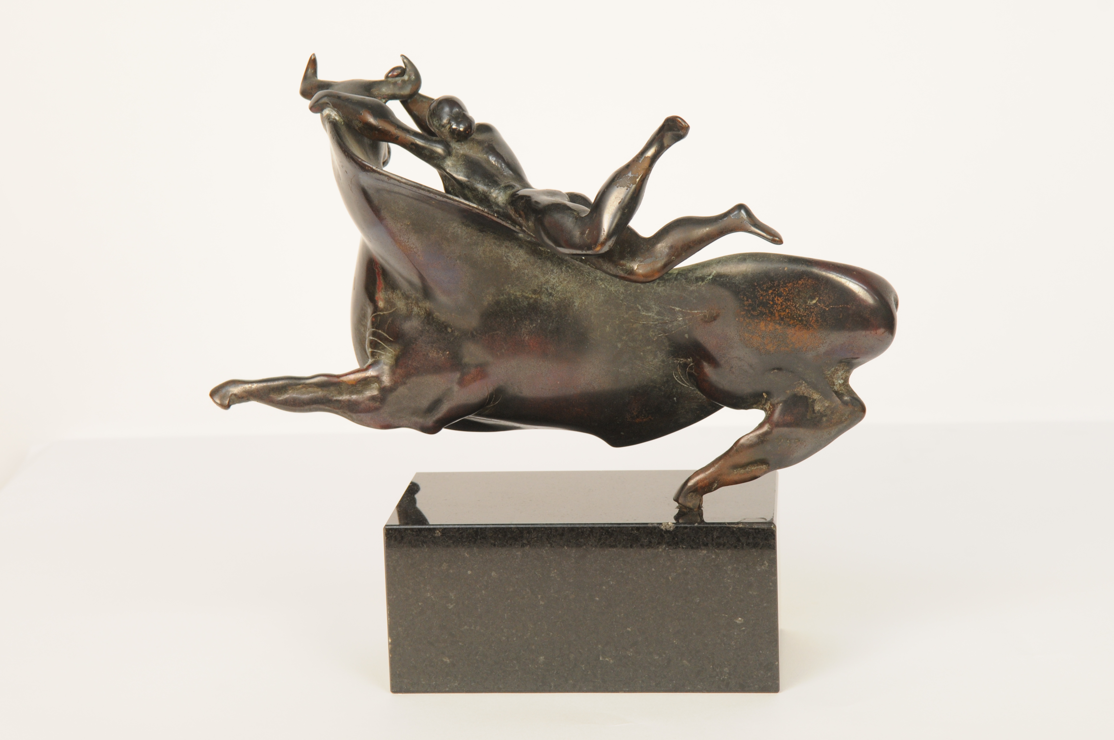 Europa wordt ontvoerd door de god Zeus in de gedaante van een stier. ongesigneerd; sokkel: zwart marmer, 8 x 18 x 10 cm. Volgens mededeling van Koert Heins heeft hij dit beeld in 1983 verworven op de verkoopexpositie 'Kunst voor Amnesty' in het Singer Museum te Laren nh