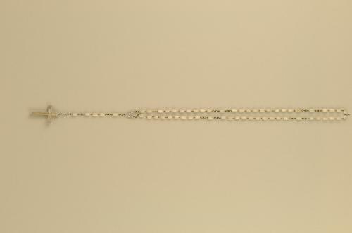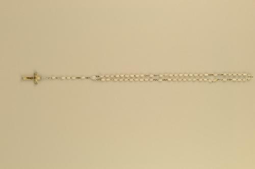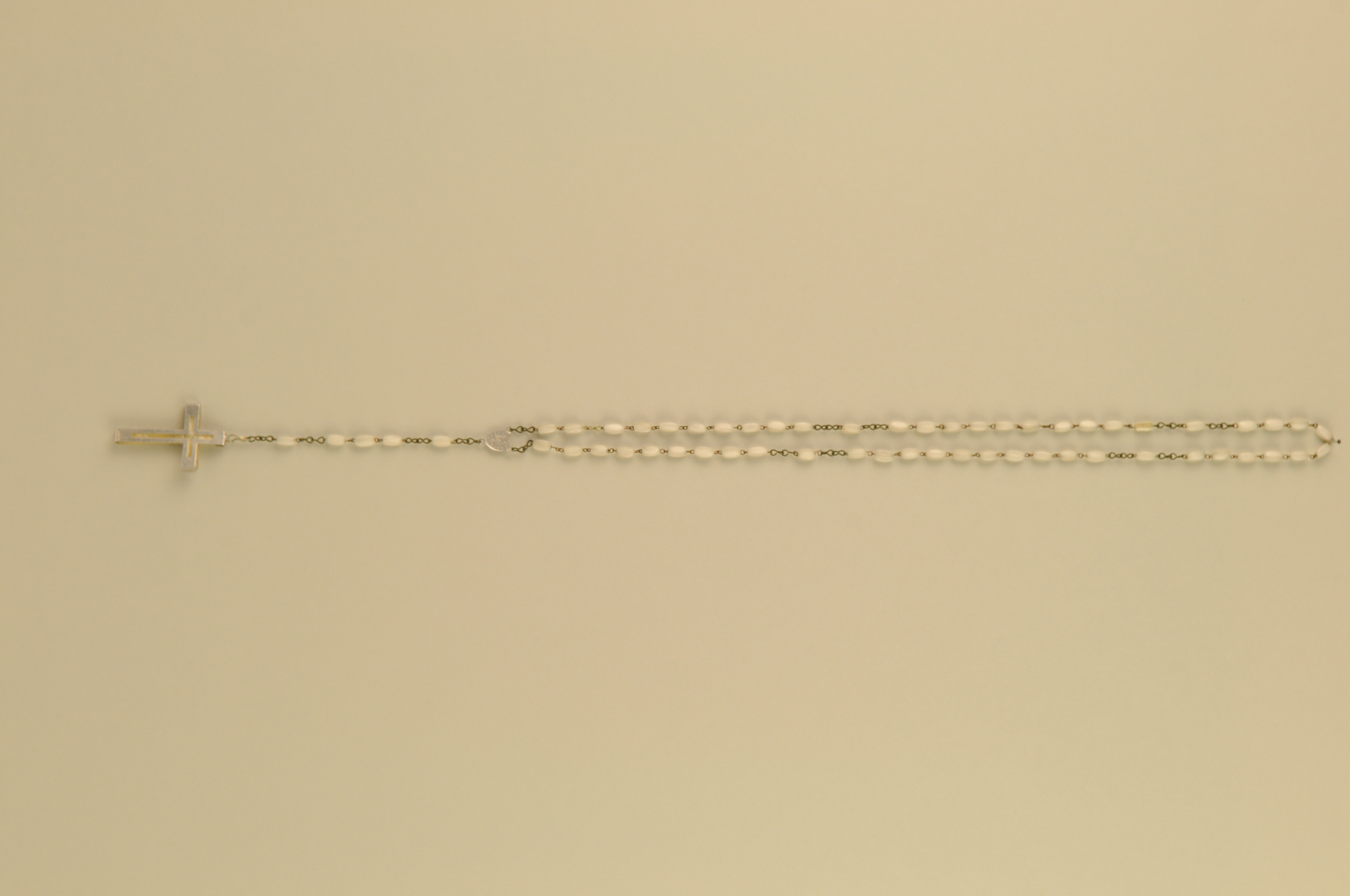 Rozenkrans – z.j., hoorn, aluminium, verzilverd messing, messing en glas, een rozenkrans met hoornen, aluminium en verzilverd messing crucifix, messing schakels en witte langwerpige glazen kralen, 45 x 2,7 x 0,7 cm