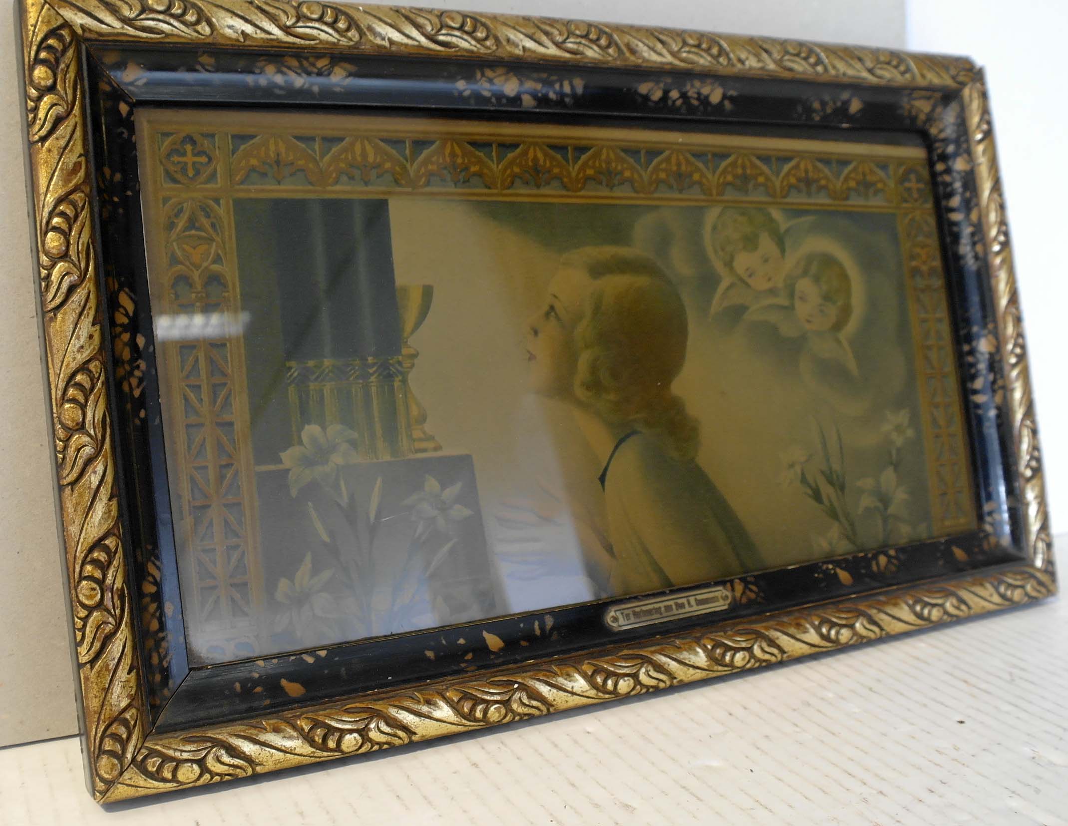 Communieprent – jaren 1930, kleurenlithografie/papier, 160 x 300 mm, communieprent met een afbeelding van een biddende vrouwelijke communicant gezien en profil n.l., in de schijn van een goddelijke lichtbundel, met links een bekleed altaar met een gordijn en een miskelk, links onder en rechts onder witte lelies, rechts boven twee engelenhoofjes, aan de linker-, boven- ...