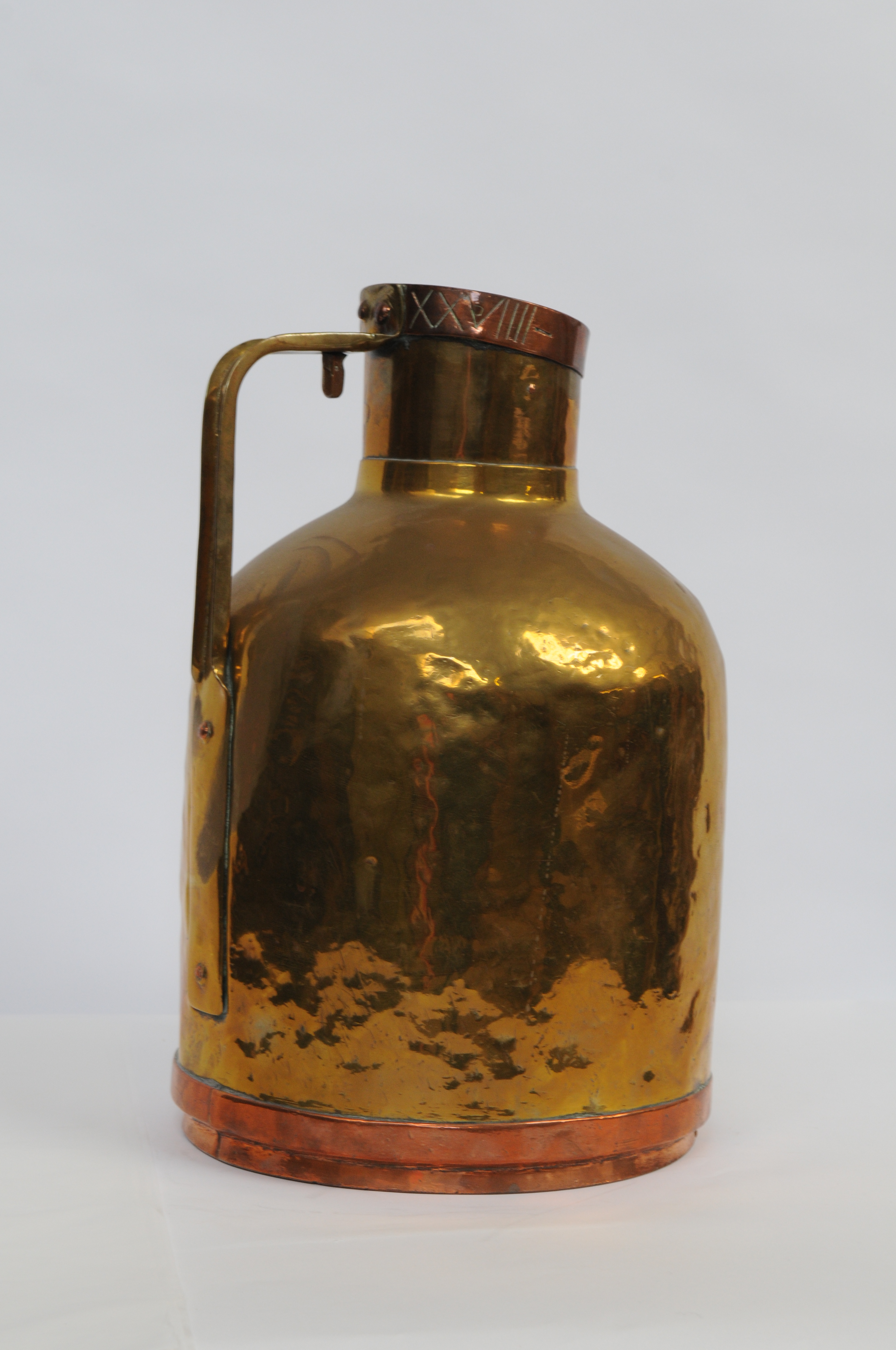 Melkkan zonder deksel - 19e eeuw, materiaal: geel en rood koper,, ingeslagen in bovenrand: 28 in arabische cijfers en XXVIIII (romeinse cijfers) Melkkan zonder deksel - 19e eeuw, materiaal: geel en rood koper, hoogte 51 cm, diameter 31 cm, ingeslagen in bovenrand: 28 in arabische cijfers en XXVIIII (romeinse cijfers)