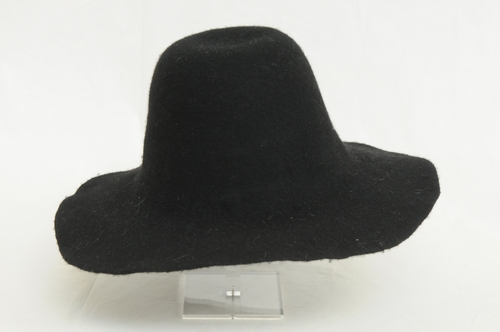 Een grote capelline, materiaal wol/vilt, kleur zwart, hoogte 13 cm, lengte 40 cm, breedte 39 cm