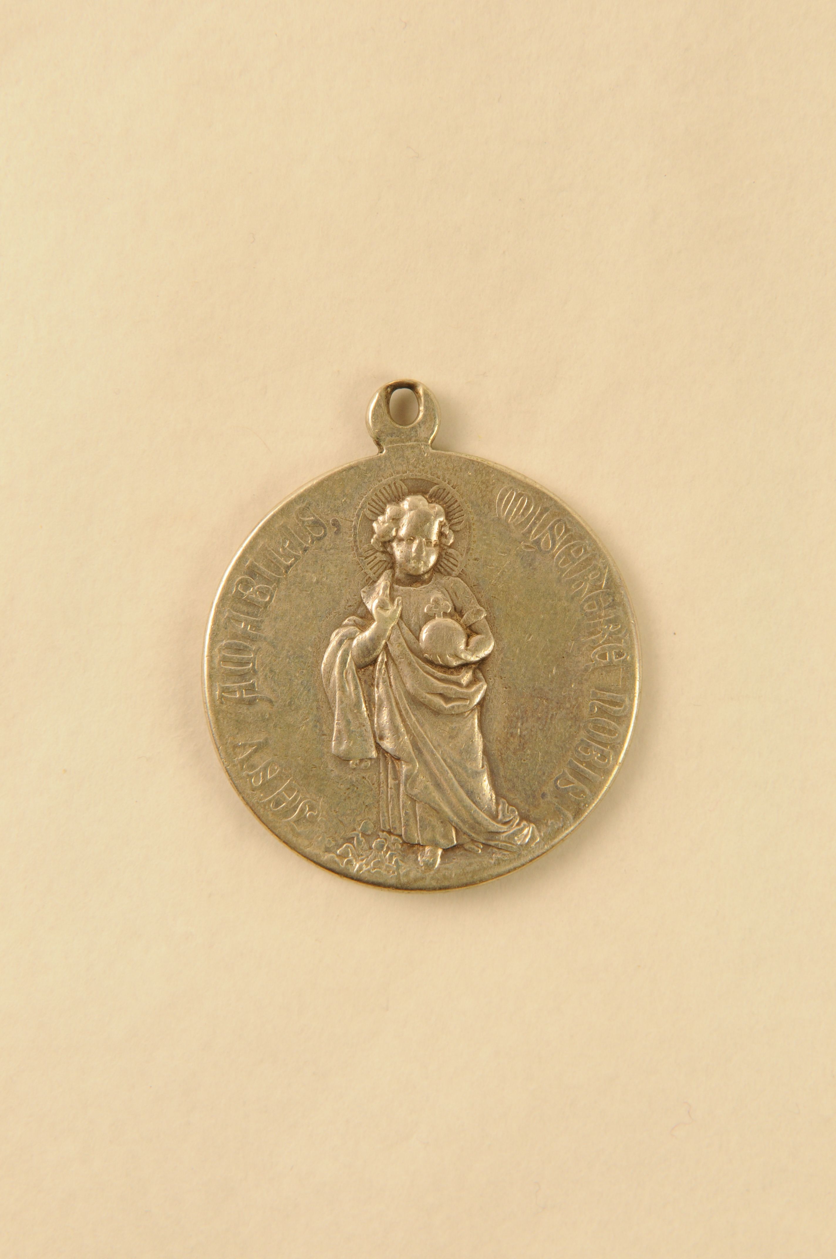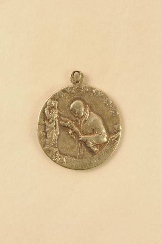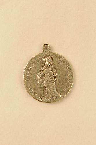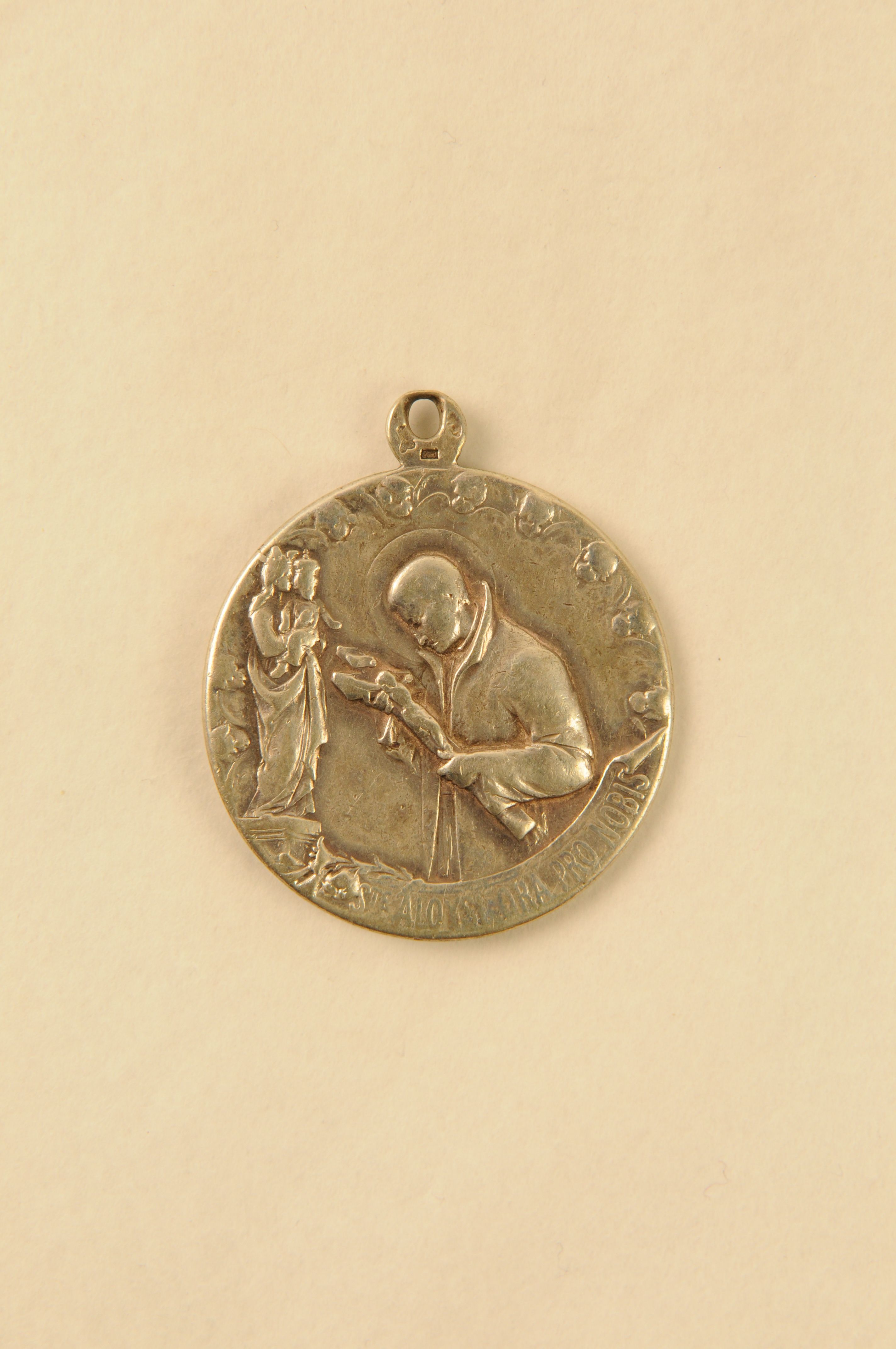 Religieuze medaille/draagpenning, materiaal: zilver, vz. reliëfafbeelding van St. Aloysius die een crucifix vasthoudt staande voor beeld van Madonna met kind en randschrift ‘STe ALOYS ORA PRO NOBIS’, kz. reliëfafbeelding van zegenend Christuskind en randschrift ‘JESU AMABILIS MISERERE NOBIS!’, met ophangoog, 4,5 x 4 cm