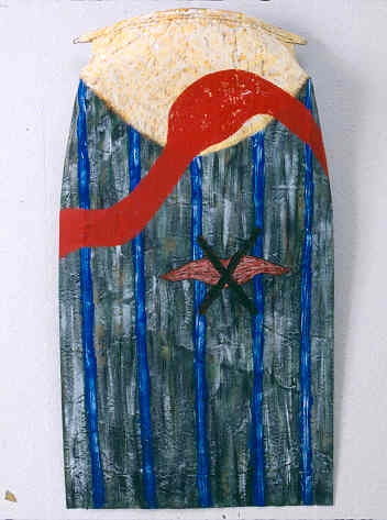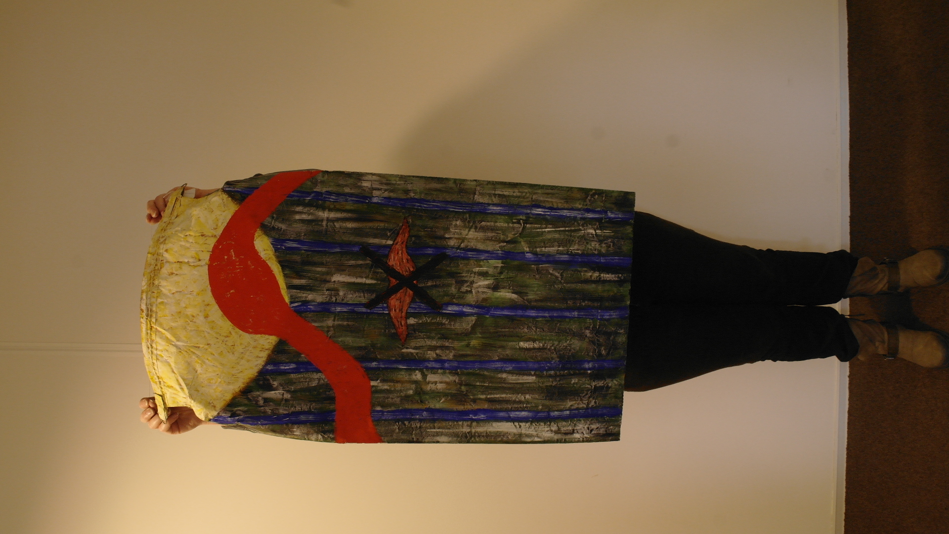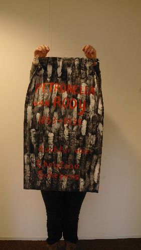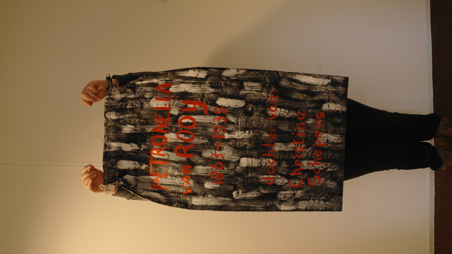 Schort Petronella (Pieta) van Rooij (1863 - 1935); project Dochters van dochters van Verrenbest. Een genealogisch beeldverhaal van Nel Verhoeven. Een exemplaar uit serie van in totaal 16 werken, schorten voorstellend, uitgevoerd in gemengde techniek