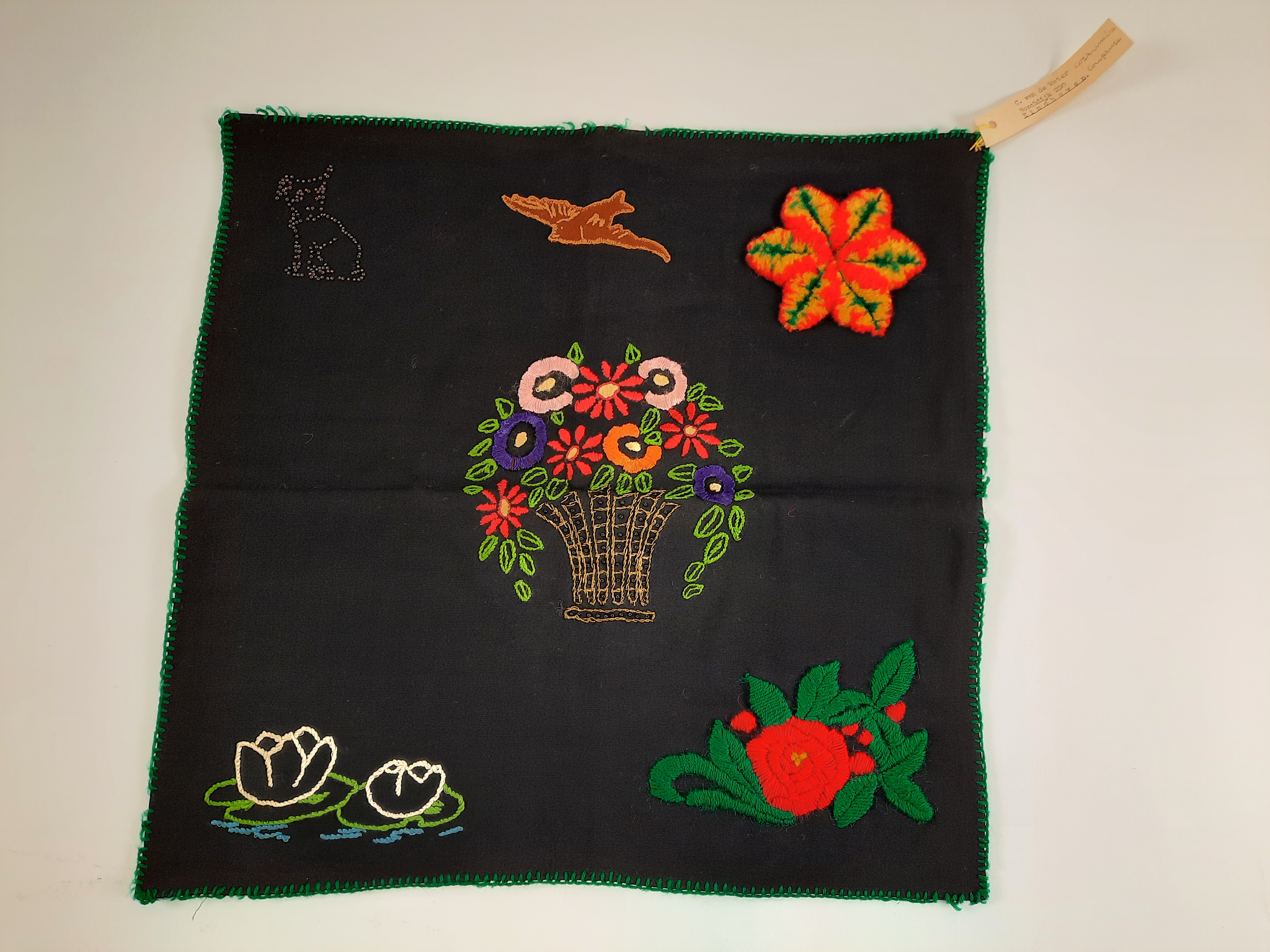 Zwarte lap met daarop in verschillende technieken geborduurd. Afgebeeld zijn: hond (met kralen), vogel met bruin vilt, bloem in rood, geel en groen (smyrna), bloem met bladeren in platsteek/satijnsteek, twee waterlelies in steelsteek, in het midden een bloemenvaas in steelsteek en satijnsteek en kralen op de vaas. De lap is afgewerkt met een groene festonsteek.