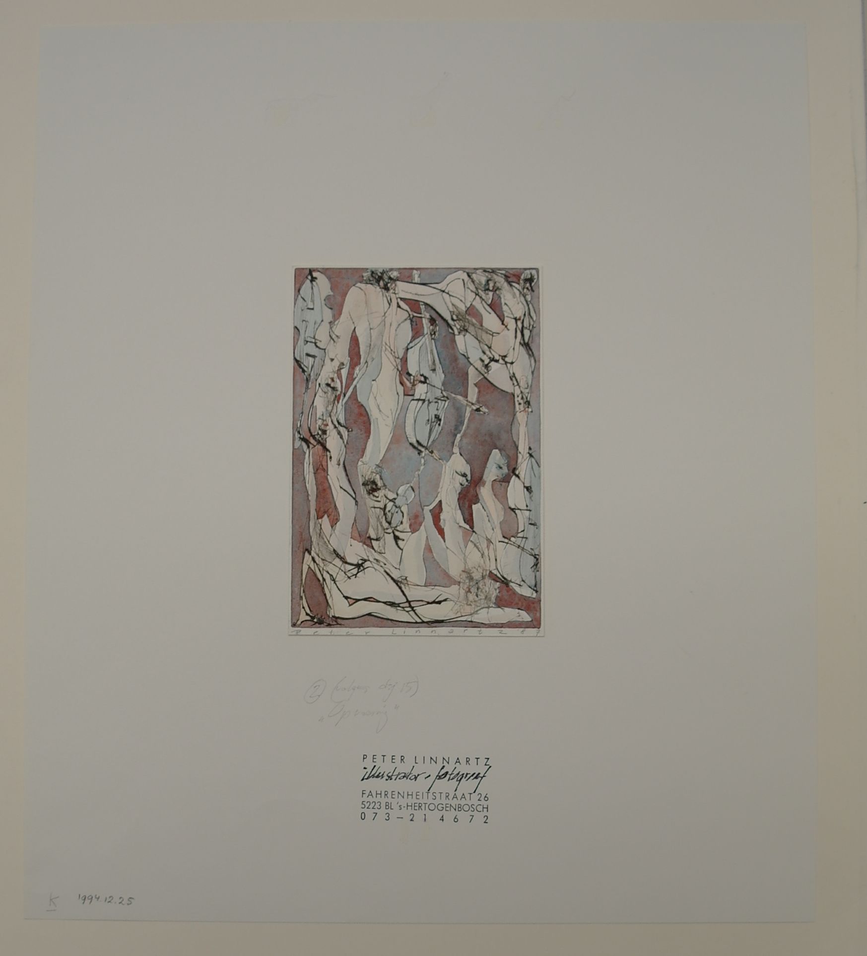 Op achterzijde: '2 (volgens d:j 15) "opvoering" Peter Linnartz, illustrator, fotograaf [...]'.