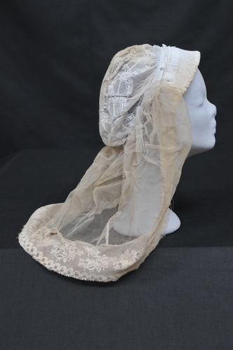 Kanten muts (bij poffer met lavelieren inv.nr 1995.04.79 a), materiaal: katoen, kleur: wit, lengte 53 cm, breedte 43 cm, bol in plumtu techniek