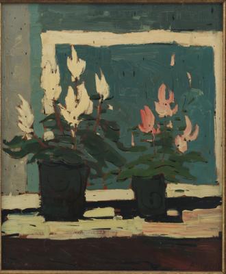 Stilleven met cyclamen - omstreeks 1960., olieverf/paneel, 60 x 50 cm, gesigneerd r.o.: A SIBENS