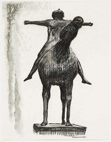 Stroomzigt te Willemstad op Curacao – 1967 (?), zwart krijt en oostindische inkt, gewassen/papier, 420 x 320 mm, gelocaliseerd en gesigneerd r.v.m.o.: CURACAO H. JAN SCHOUTEN