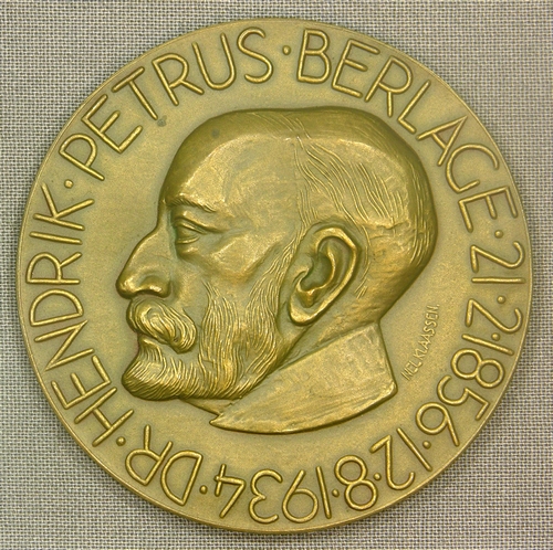 Penning Dr H P Berlage (1856-1934), tweede penning VPK 1934, slagpenning, brons, diameter 60 mm, vz. portret van Berlage n.l. met het randschrift ‘DR.HENDRIK.PETRUS.BERLAGE.21.2.1856.12.8.1934.’ en signatuur ‘NEL KLAASSEN’, kz. zuidzijde van de Beurs van Berlage met campanile en het randschrift ‘BEIDT UW TIJD DUUR UW UUR’, gemonogrammeerd PK (ineen), uitgevoerd door Koninklijke Begeer Voorschoten