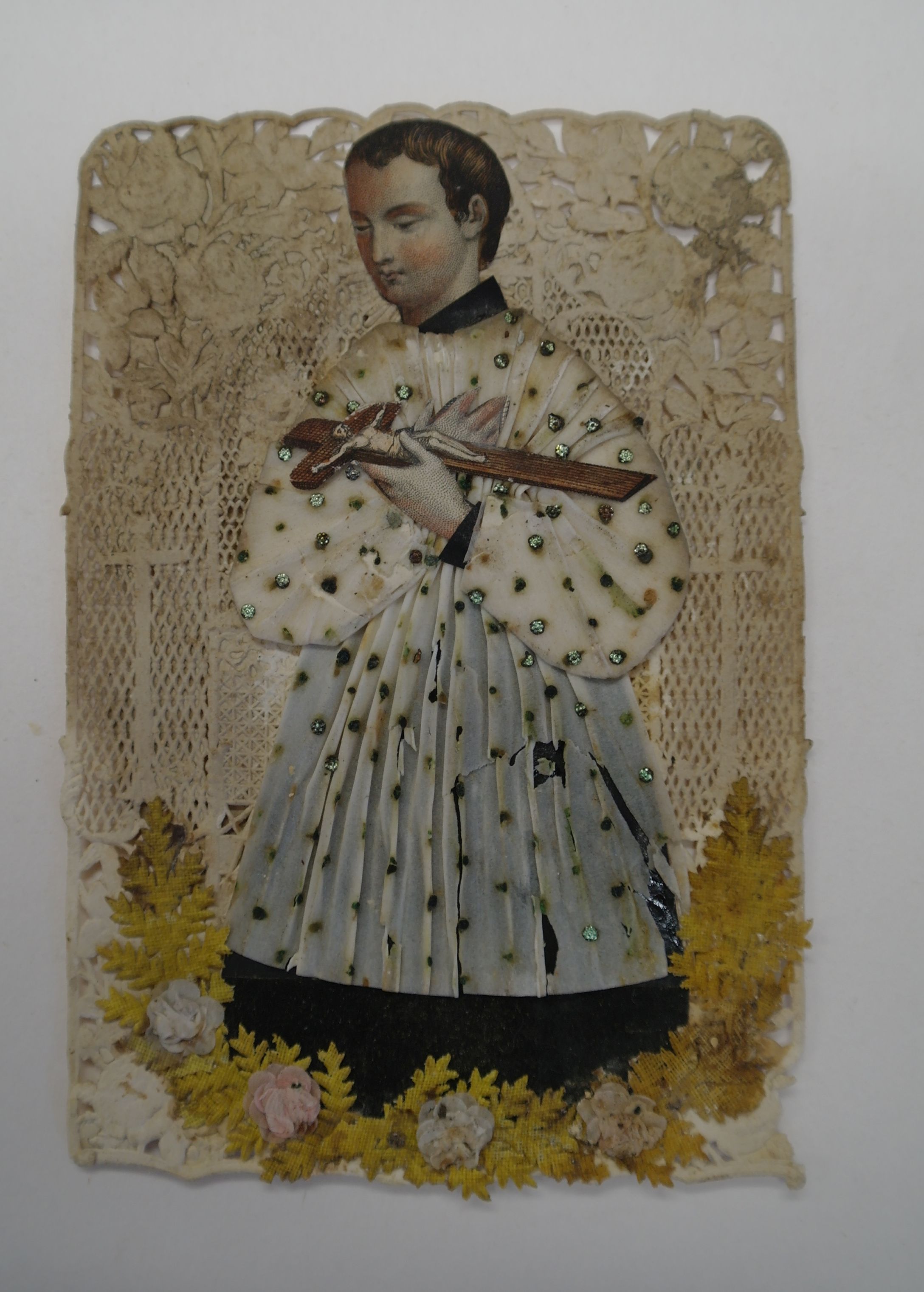 Devotieprent, appliqué-prentje, papier, textiel en gravure/papier (houten lijstje in stukken), afbeelding van jonge mannelijke heilige, mogelijk Aloysius van Gonzaga, met kruis in de hand en in geplooid gewaad, eromheen een in papier gestanste (rand)decoratie en florale motiefjes van geappiqueerde textiel, zoals bloemrozetjes, datering midden 19e eeuw, herkomst vmdl. Bohemen of Moravië, 110 x 77 mm,