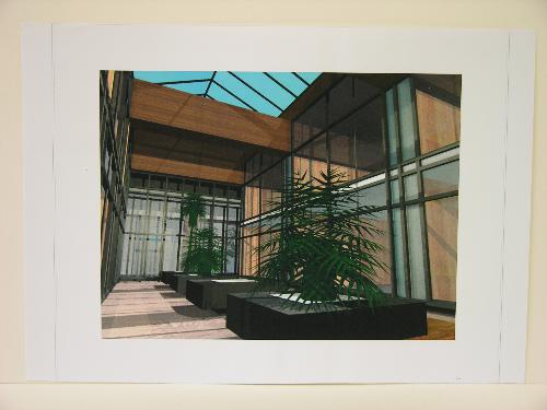 Ontwerp voor interieur kantoren in de voormalige St. Vincentiuskerk in Woensel, kleurendruk/papier, 300 x 400 mm., foto: coll. Van Aken Architectuur en Stedenbouw, Fotoprints bij expositie 'Geloven in Eindhoven', n.a.v. Open Monumentendag 2005, in passe-partout, telkens twee prints in 1 passe-partout
