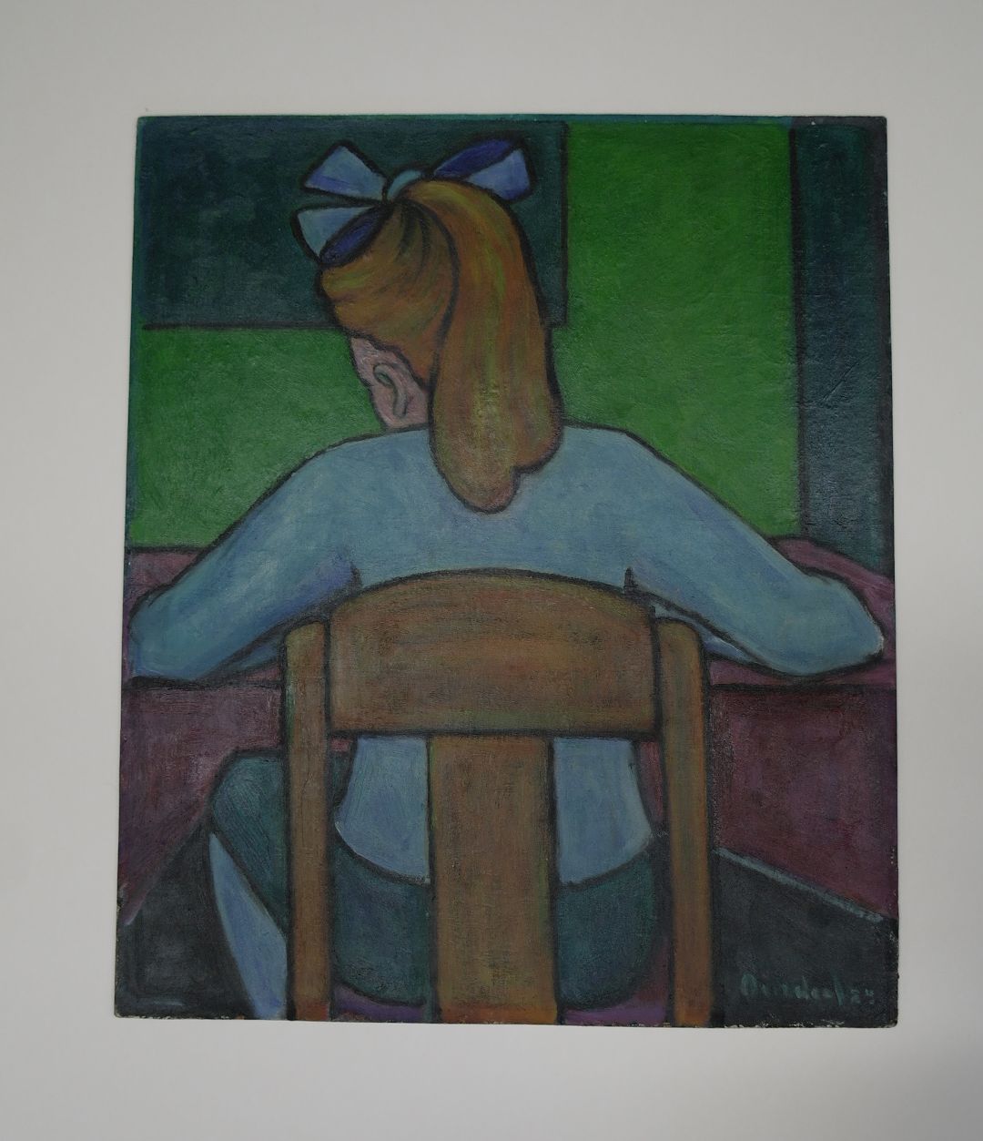 Dochter Ank Overweel aan tafel huiswerk makend. – 1953, olieverf/paneel, 46,5 x 39 cm