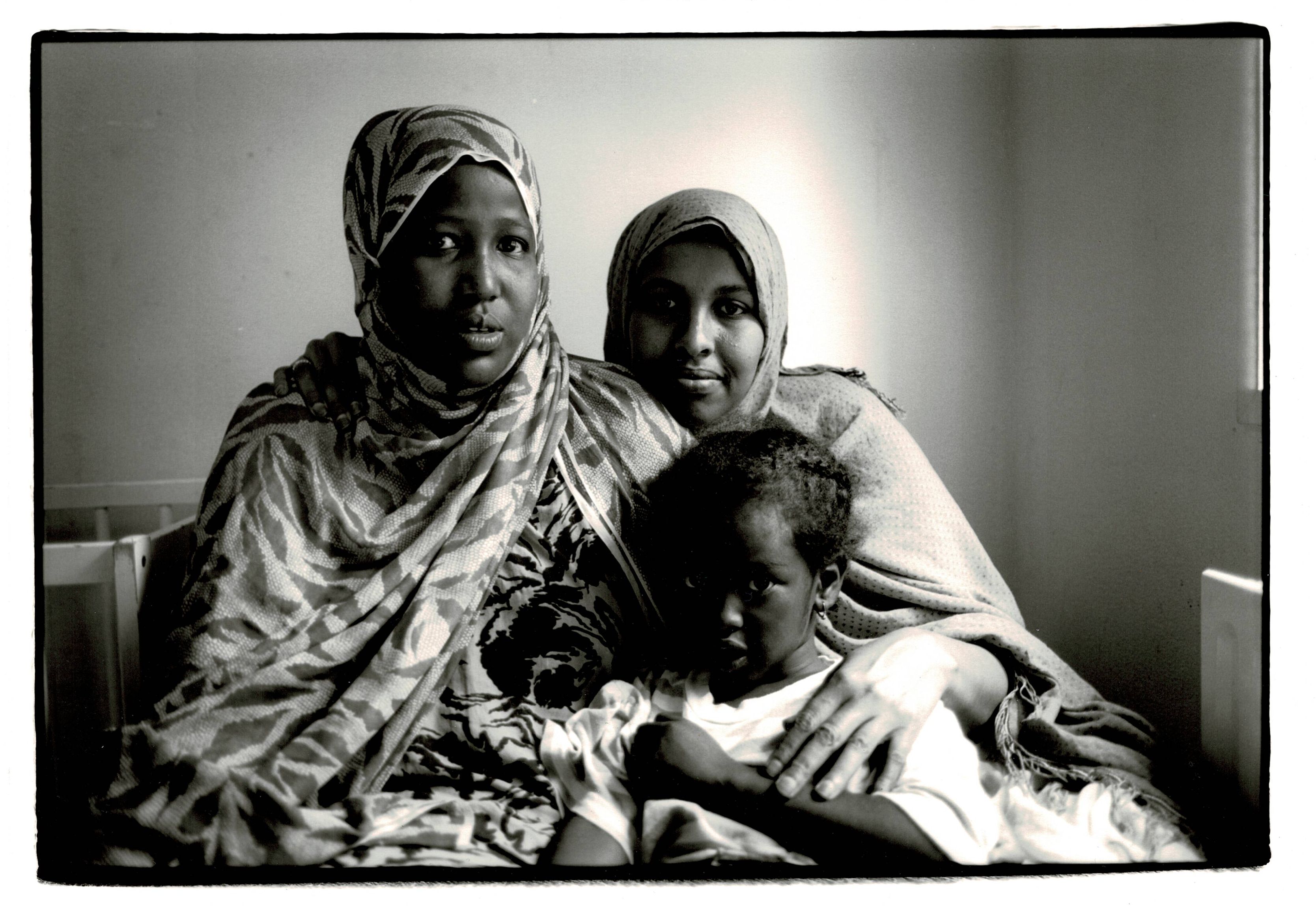 Twee vrouwen en meisje uit Soedan (?), Beatrixoord – 1996, 18 x 26,5 cm, zwart/wit foto/papier