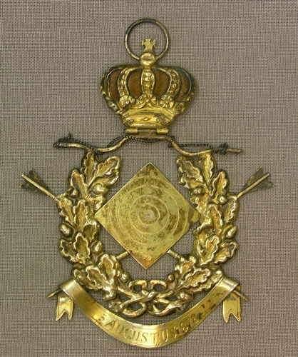Prijspenning, zilver (gemerkt), Centraal rechthoekige schietschijf op z'n punt staand en omkranst met lauwertakken van eikenblad met pijlelementen. Onderaan: banderol-lint met inschrift: ' 5 augustus 1878' bovenaan tegen handboog scharnierend kroontje met bolkruisje en draagringetje. Inschrift verso: 'EEREPRIJS BUITENLUST HELMOND' Prijspenning handboogschutterij, materiaal: zilver (gemerkt), centraal rechthoekige schietschijf op z'n punt staand en omkranst met lauwertakken ...