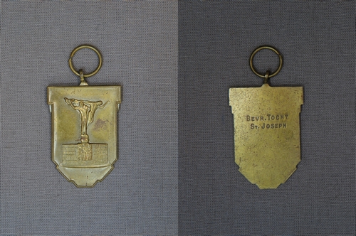 Wandeltochtmedaille Bevrijdings Tocht St. Joseph, Eindhoven - 2e helft van de 20e eeuw, materiaal: metaallegering, afmetingen: 5 x 2,5 x 0,1 cm, vz: reliëfafbeelding van de beeldengroep voor POC Eindhoven, kz. opschrift: 'BEVR. TOCHT ST. JOSEPH' (in kapitalen), inclusief draagringetje