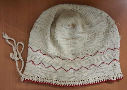 Kruikezak, materiaal: katoen, kleur: ecru/rood, lengte 33cm, breedte 36 cm, gebreide kruikezak behorende bij metalen kruik (genummerd 1989.01.04a), gebreide brede rand met rood opgemaast, onderkant gehaakte rand ecru en rood om koord door te rijgen, bovenin is een achthoekige ster gehaakt De kruikezak is gemaakt door mevrouw Henriëtte Caderius-Caderius Van Veen (later getrouwd met dr Vinkenborgh)
