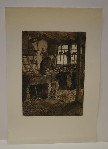 Hoefsmid aan het werk - z.j., ets in bruin/papier, 352 x 257 mm, gesigneerd in plaat r.o.: J. van Raay, gesigneerd in potlood onder plaat l.o.: Jozef van Raay In een werkplaats, staat een man, gekleed in een trui, met pet op het hoofd en bril, aan zijn werktafel gebogen over zijn werk. Rechts zijn twee ...