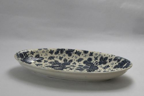 Vleesschaaltje - 1e helft van de 20e eeuw, witbakkend geglazuurd aardewerk, afmetingen: 4 x 25 cm, vlessschaaltje versierd met bloemmotief in blauw-wit, op de onderzijde van de bodem gemerkt: 'SOCIETE CERAMIQUE MAESTRICHT MADE IN HOLLAND BEATRIX', geen blindstempel gemerkt: SOCIETE CERAMIQUE MAESTRICHT MADE IN HOLLAND BEATRIX geen blindstempel