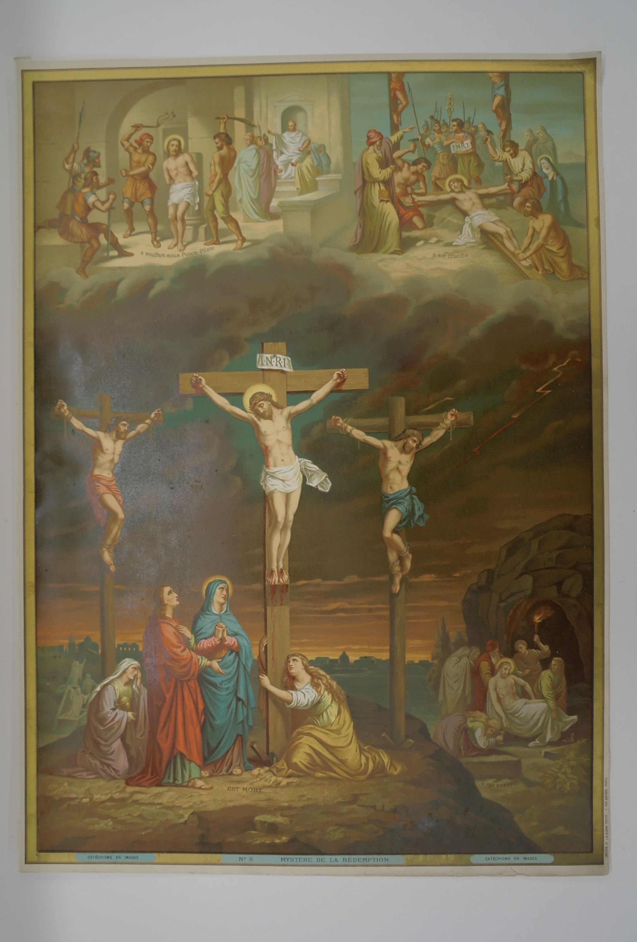 reeks: catéchisme en images no. 5 (deel uit geloofsbelijdenis: ...Hij heeft geleden onder Pontius Pilatus, Hij is gekruisigd, gestorven en begraven...)