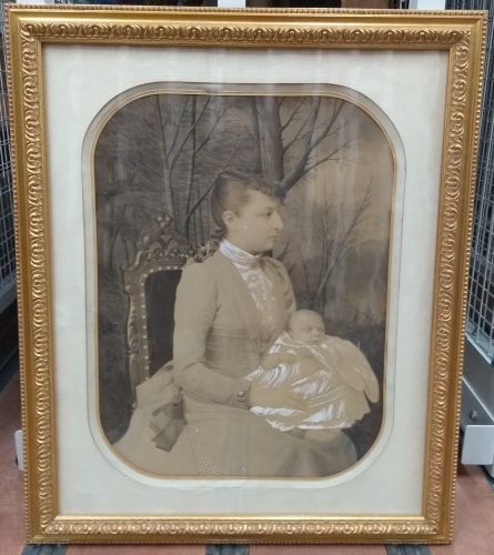 Zwart-witfoto en profil van mevrouw Fens en een overleden zuigeling op haar schoot. Mevrouw Fens zit op een stoel versierd met houtsnijwerk. Op de achtergrond zien we bomen. Zwart-witfoto in passepartout met afgeronde hoeken. In goudkleurige lijst.
