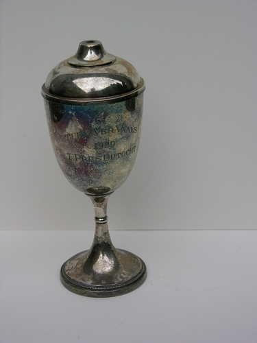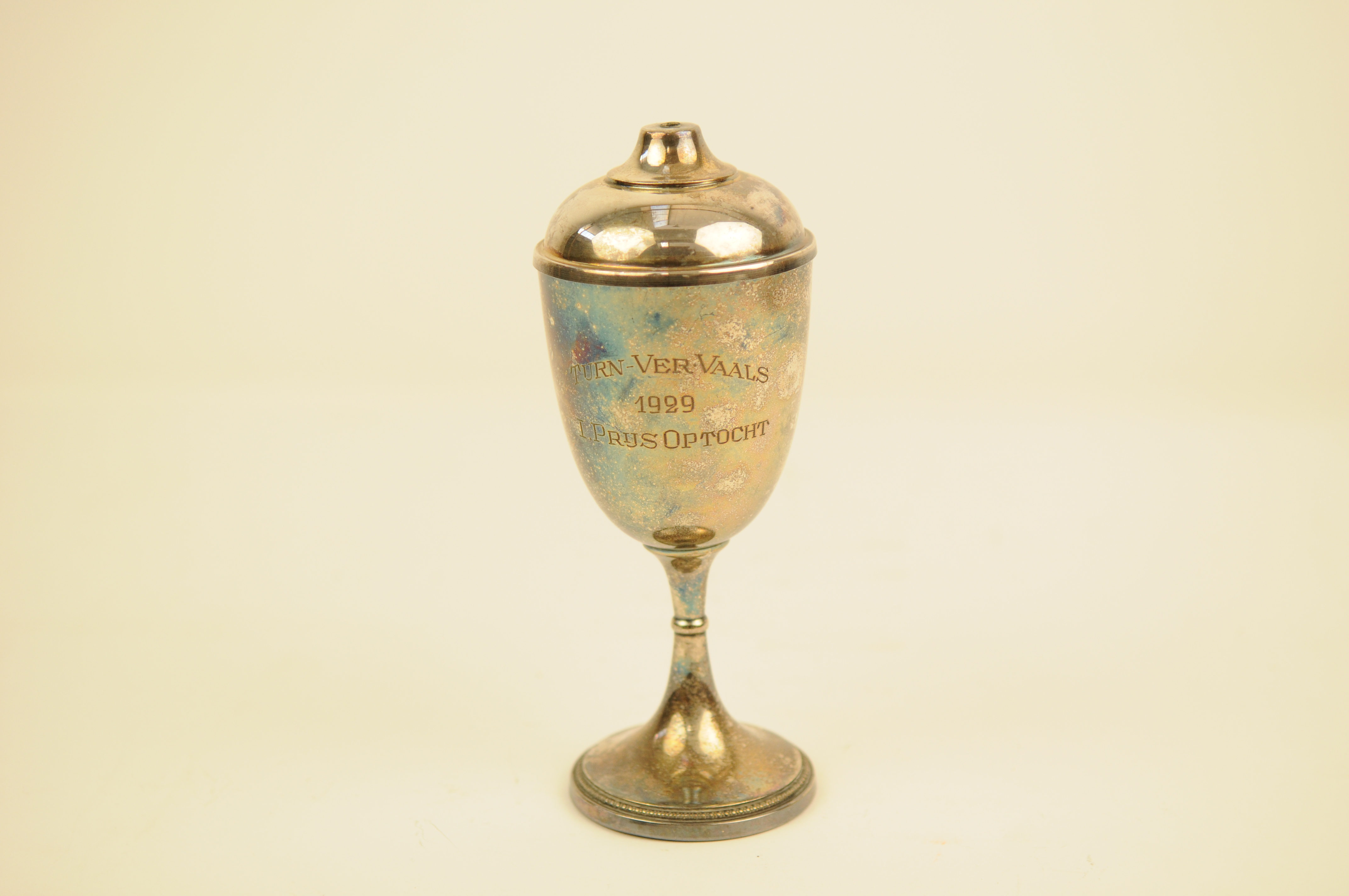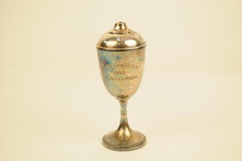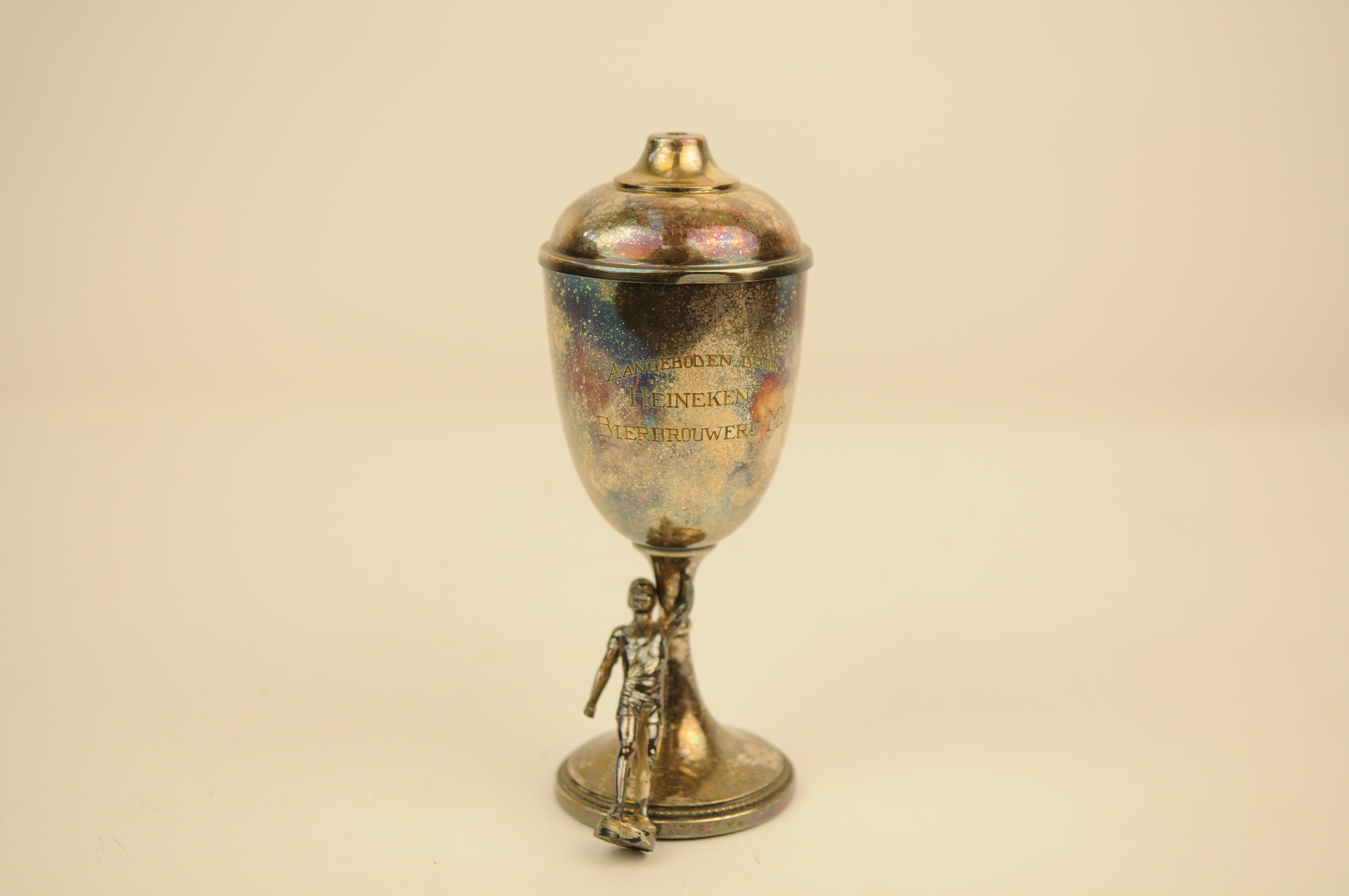 Prijsbeker met losse deksel, greep ontbrekend (figuurtje ?), inschrift: aangeboden door Heineken's bierbrouwerij Mij.