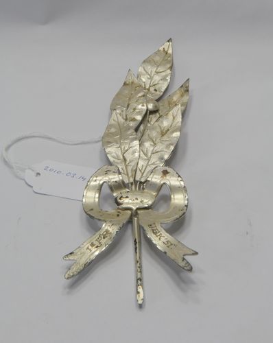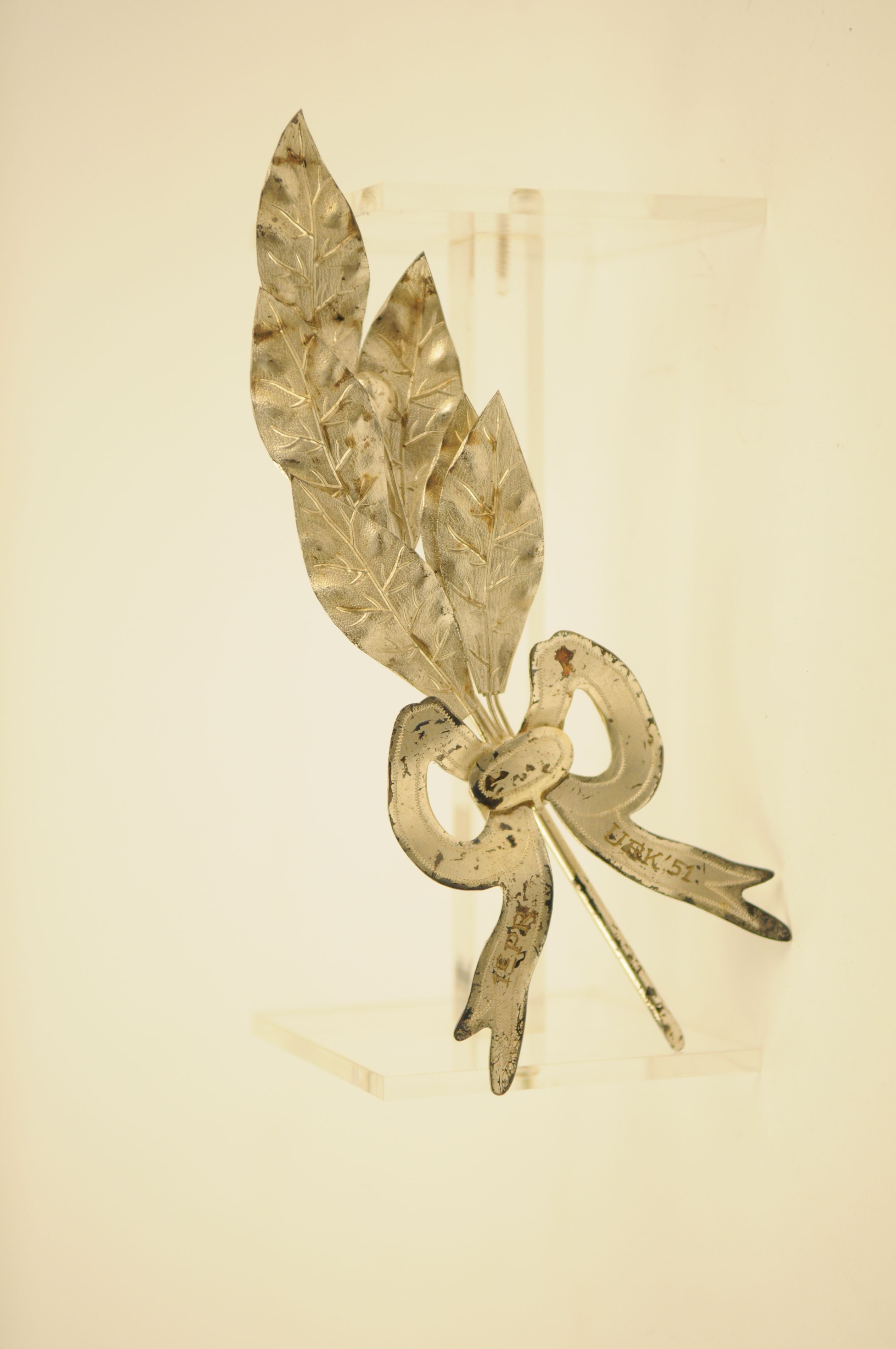 Lauwertak - 1951, materiaal: metaal, verzilverd, afmetingen: 17 x 6 x 1,5 cm, zesbladige lauwertak met één vrucht en symmetrisch uitgewerkt banderole-lint met de inscriptie: ‘1E PR. URK ‘51’