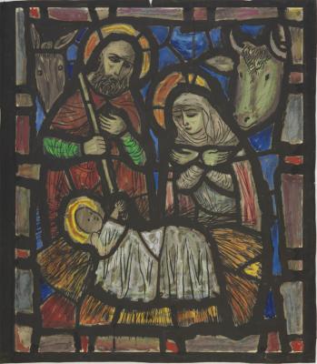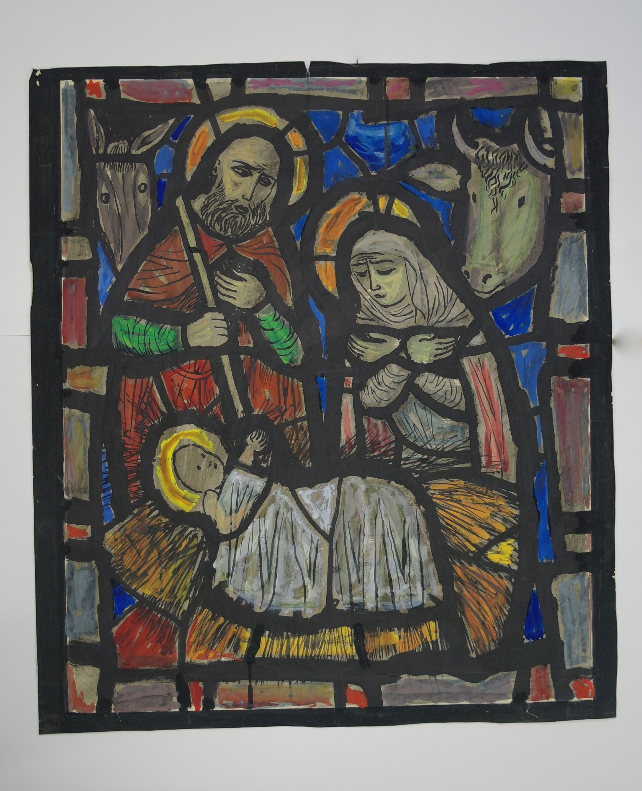 Tekening van fragment Mariaraam St. Catharinakerk te Eindhoven (in absis); Geboortescene: kind, Maria, Jozef, os en ezel, gouache en aquarel/papier Tekening van fragment Mariaraam St. Catharinakerk te Eindhoven (in absis); Geboortescene: kind, Maria, Jozef, os en ezel, gouache en aquarel/papier, 770 x 675 mm