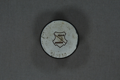 Prijsbeker voetbalvereniging RKSV, met (vaste) deksel bekroond door medaillon, waarop twee voetballende jongens zijn afgebeeld, omgeven door een lauwerkrans. Plastic standvoet. Prijsbeker voetbalvereniging RKSV, met (vaste) deksel bekroond door medaillon, waarop twee voetballende jongens zijn afgebeeld, omgeven door een lauwerkrans. Plastic standvoet. Materiaal metaal en plastic, deels verchroomd, hoogte 33,5 cm, diameter 12,5 cm. Opm: tekstschildje ...