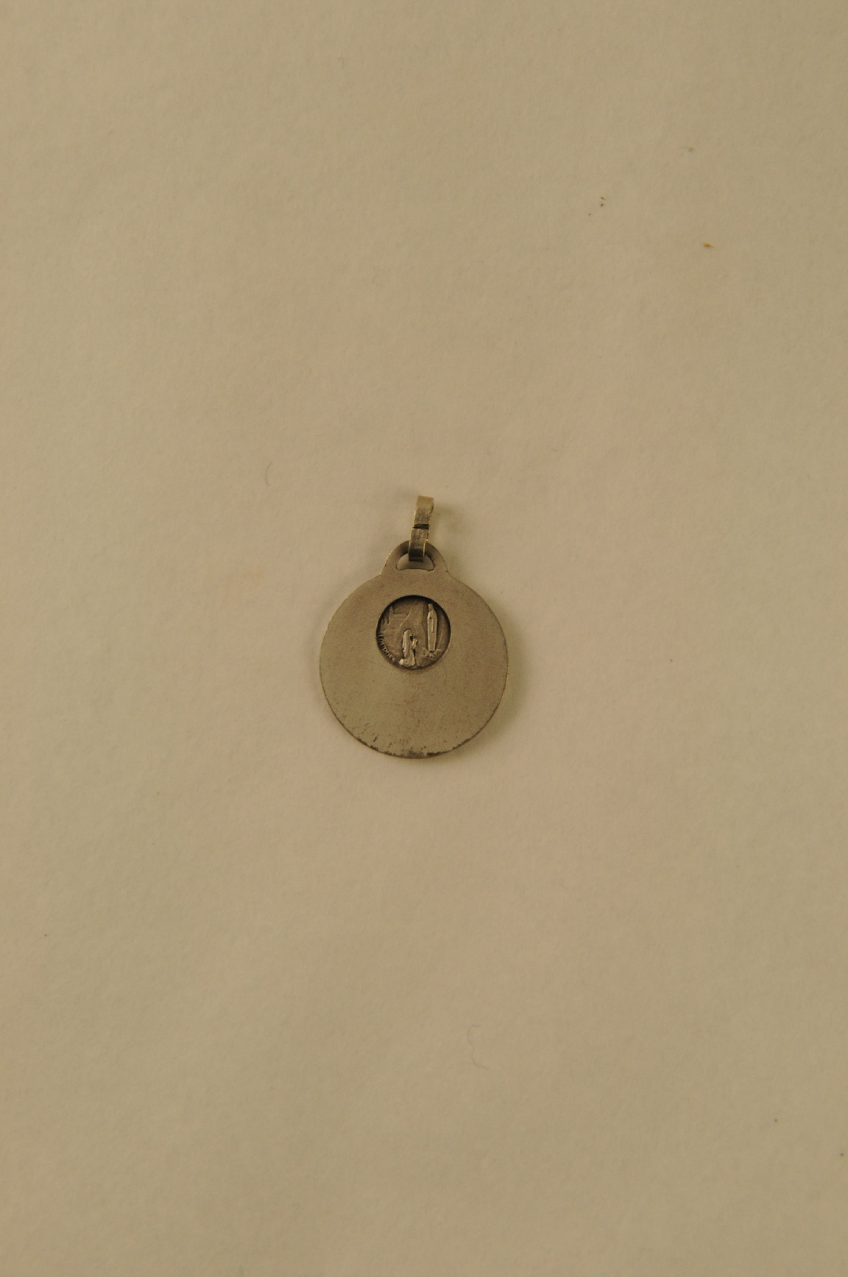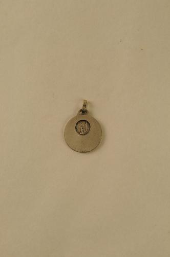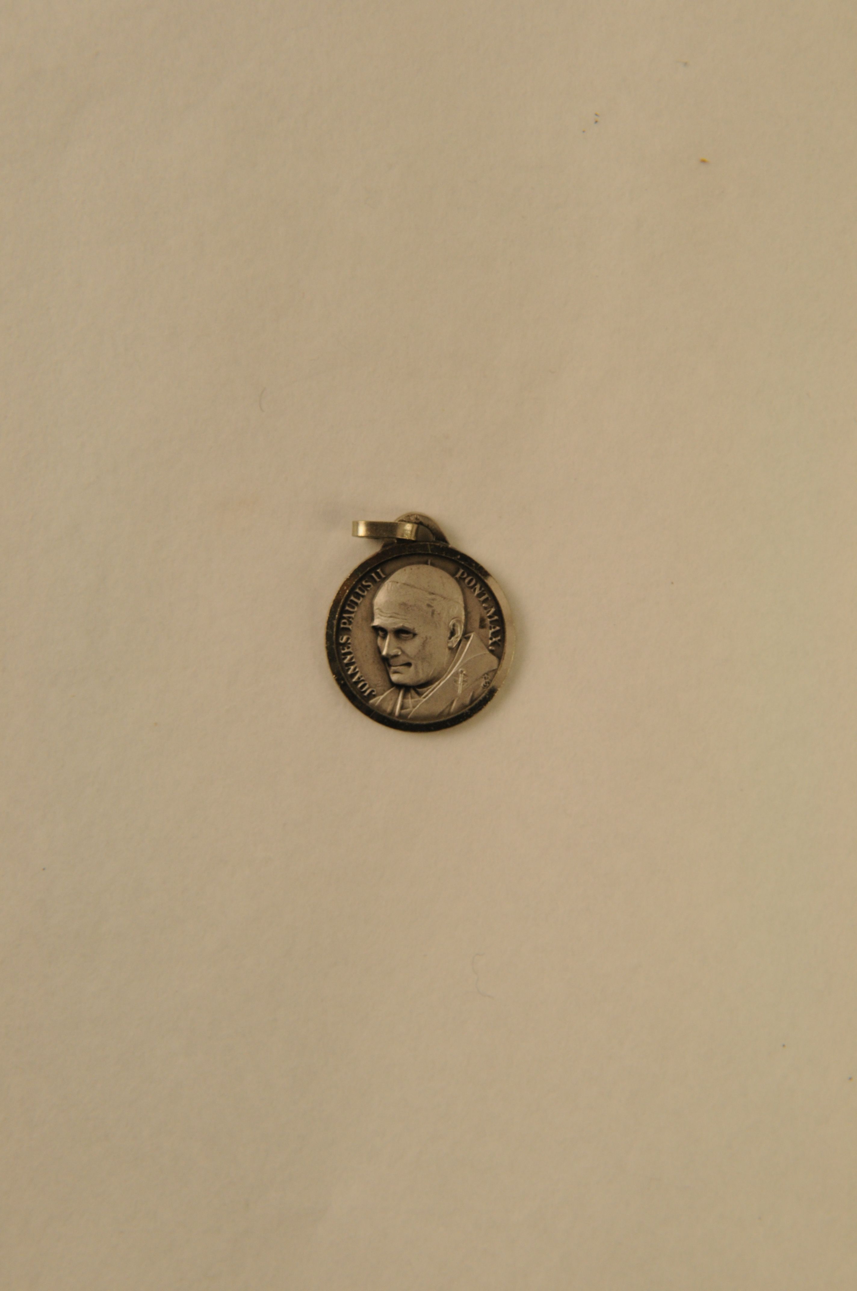 Religieuze medaille/draagpenning, materiaal: metaal, deels verchroomd, ronde penning met aan vz. portret van paus Joannes Paulus II n.l. met randschrift ‘JOANNES Paulus II / PONT. MAX.’ en op kz. een kleine afbeelding van de verschijning van Maria aan Bernadette Soubirou in Lourdes, 2,8 x 2,1 x 0,1 cm