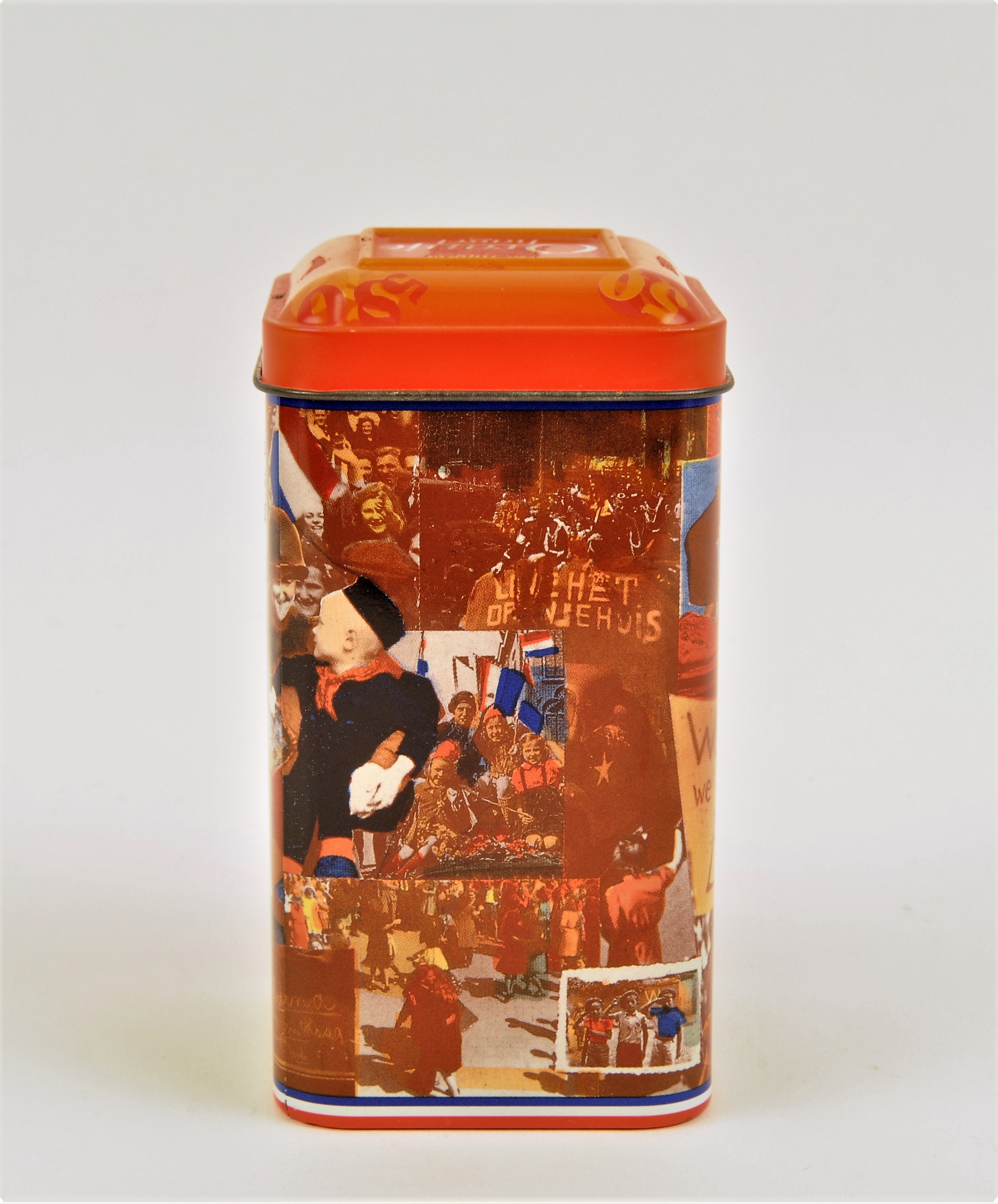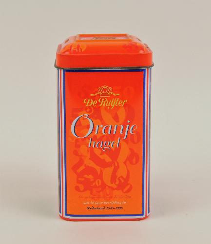 Een blikken busje voor Oranje hagel van de Ruijter te Baarn, uitgegeven ter gelegenheid van de viering van vijftig jaar bevrijding in Nederland 1945-1995.