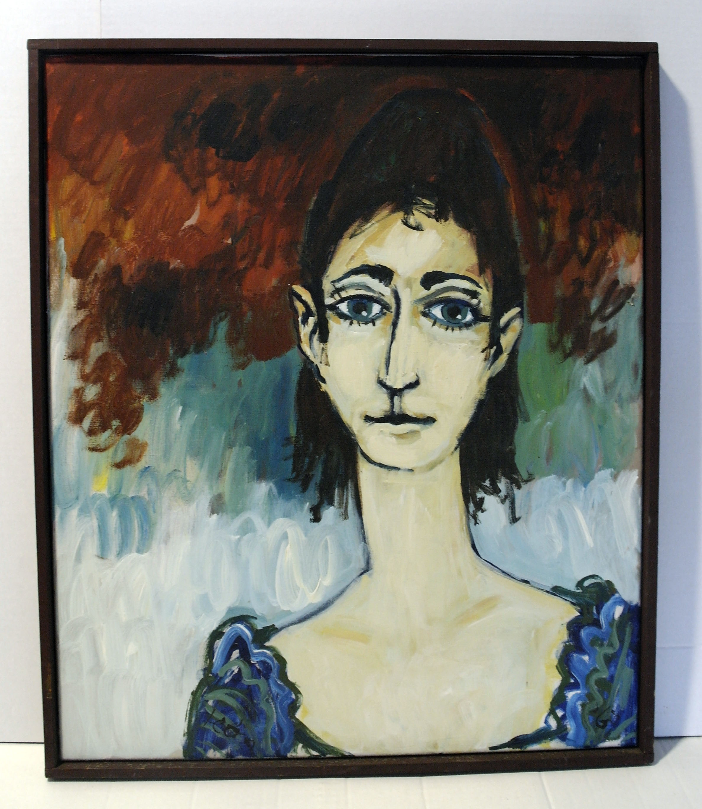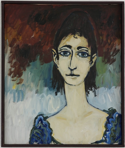 Zonder titel (Portret en face van jonge vrouw in blauw/groene jurk) - 1967, acrylverf/doek, 60 x 50 cm, gesigneerd en gedateerd r.o.: león ’67