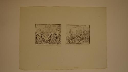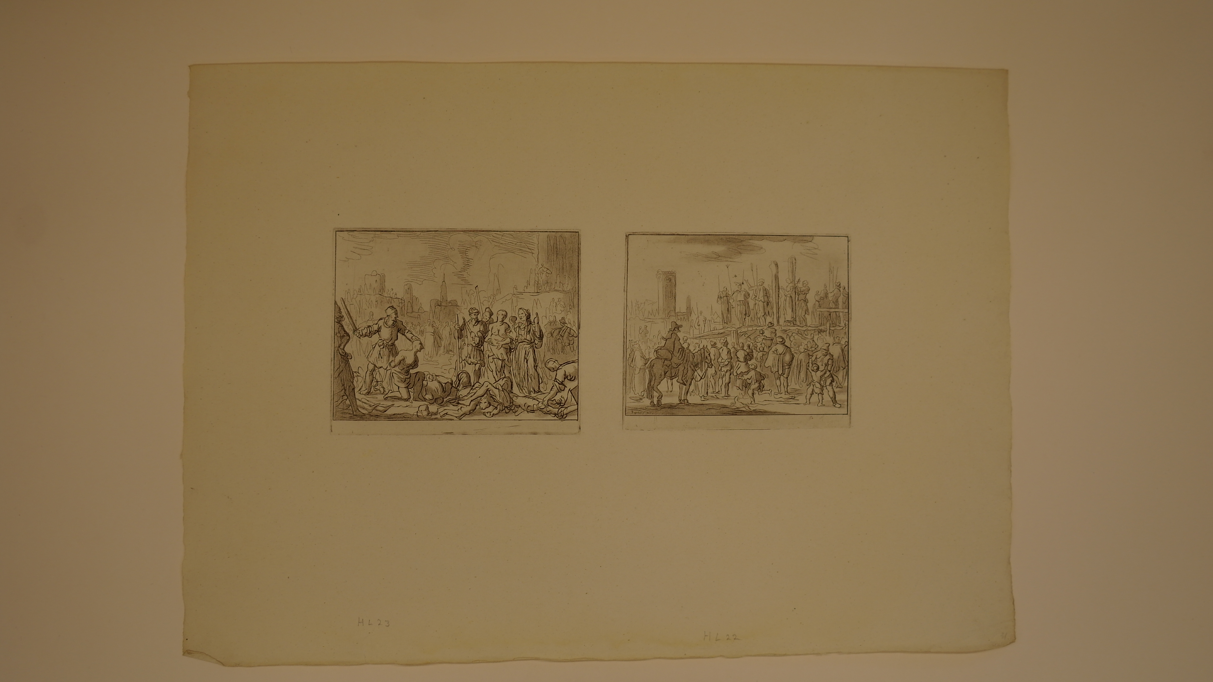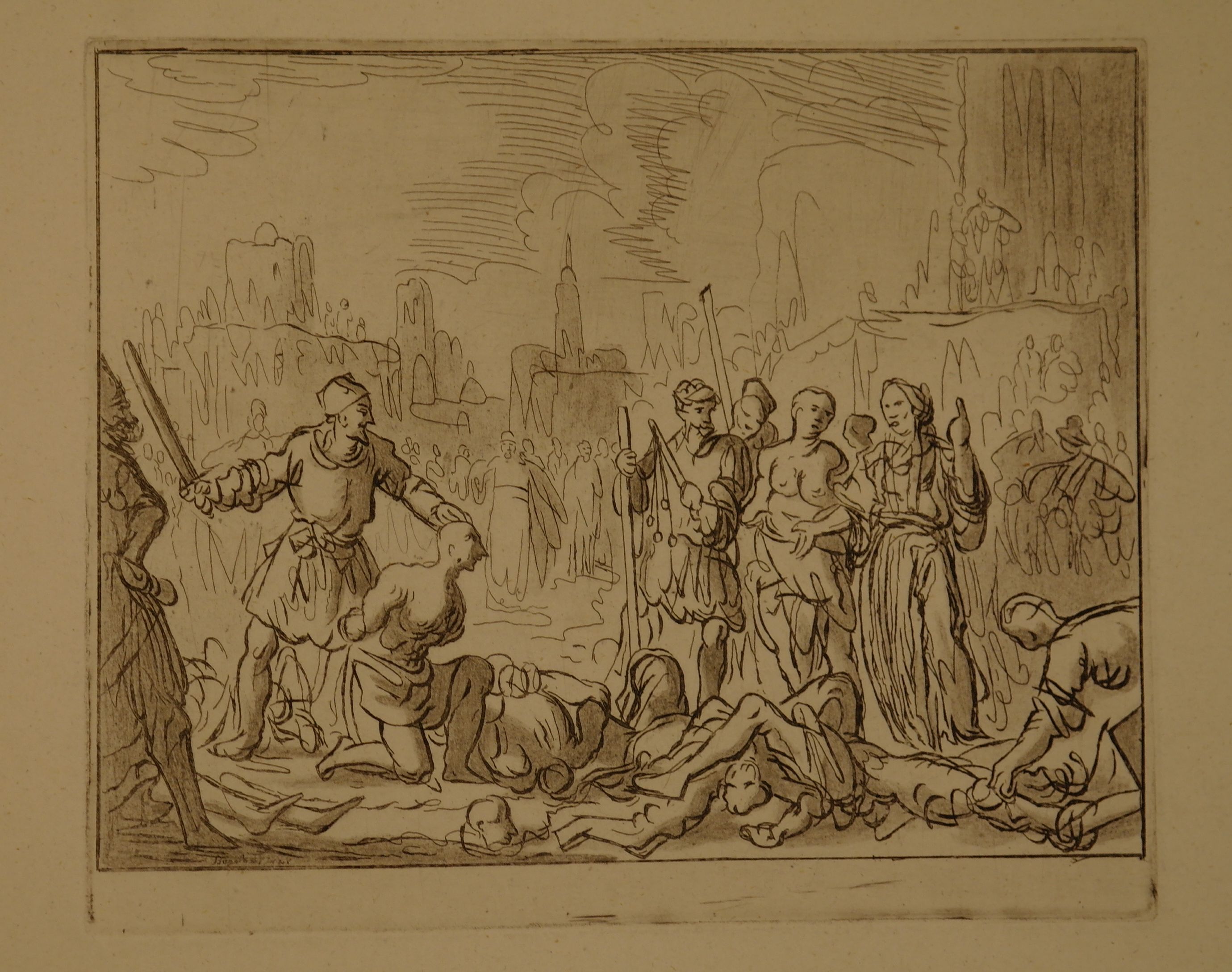 Op een plein met mensen is een schavot opgesteld. Een persoon is reeds onthoofd, een half ontklede vrouw wordt vermaand door een andere. Het plein is omgeven door diverse gebouwen. gesigneerd en gedateerd l.o.: Bagelaar f 1805 gewassen in aquatint H&L (T. Hippert en J. Linnig) Le Peintre-graveur hollandais et belge du 19me siècle, 1879) nr. ...