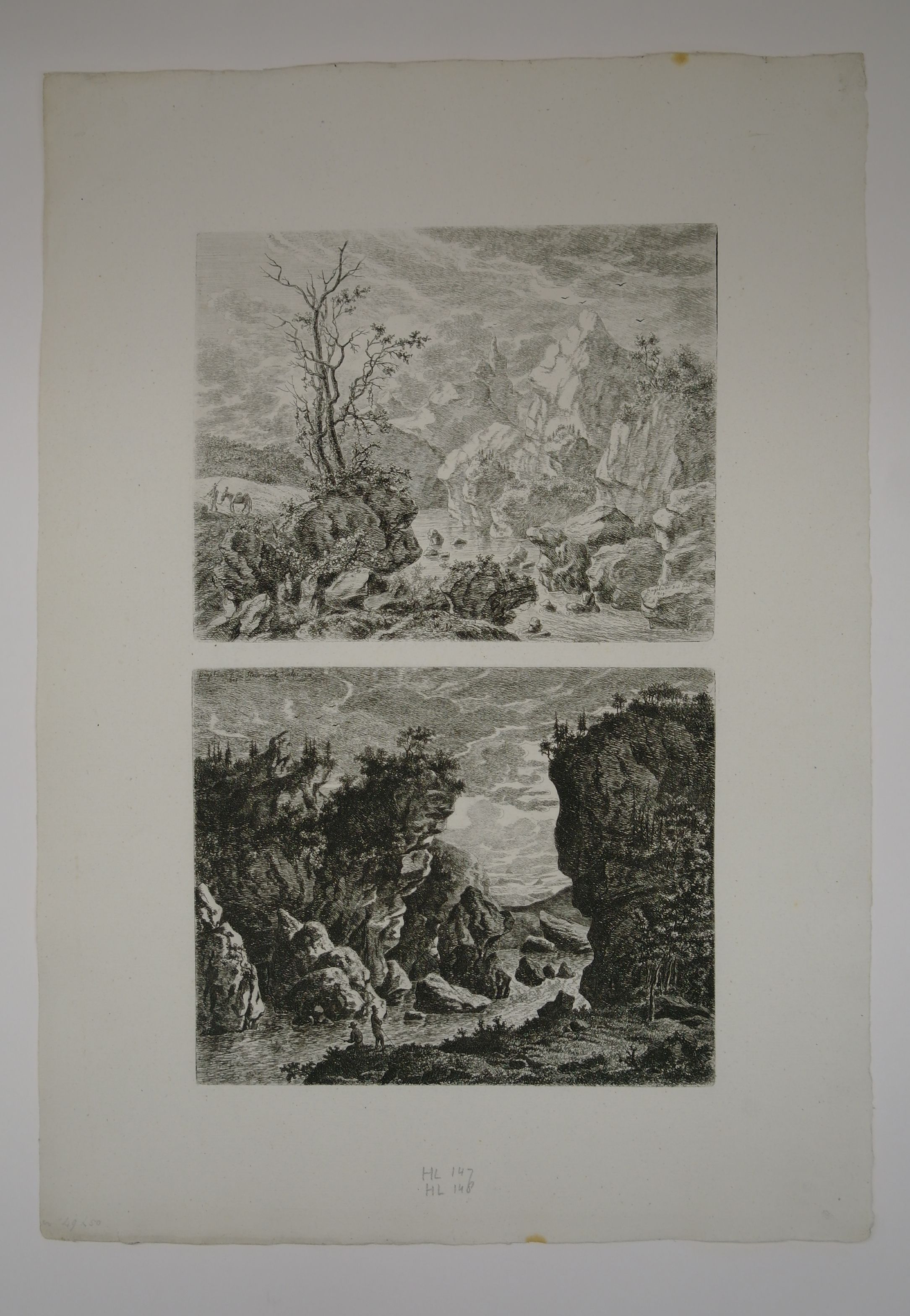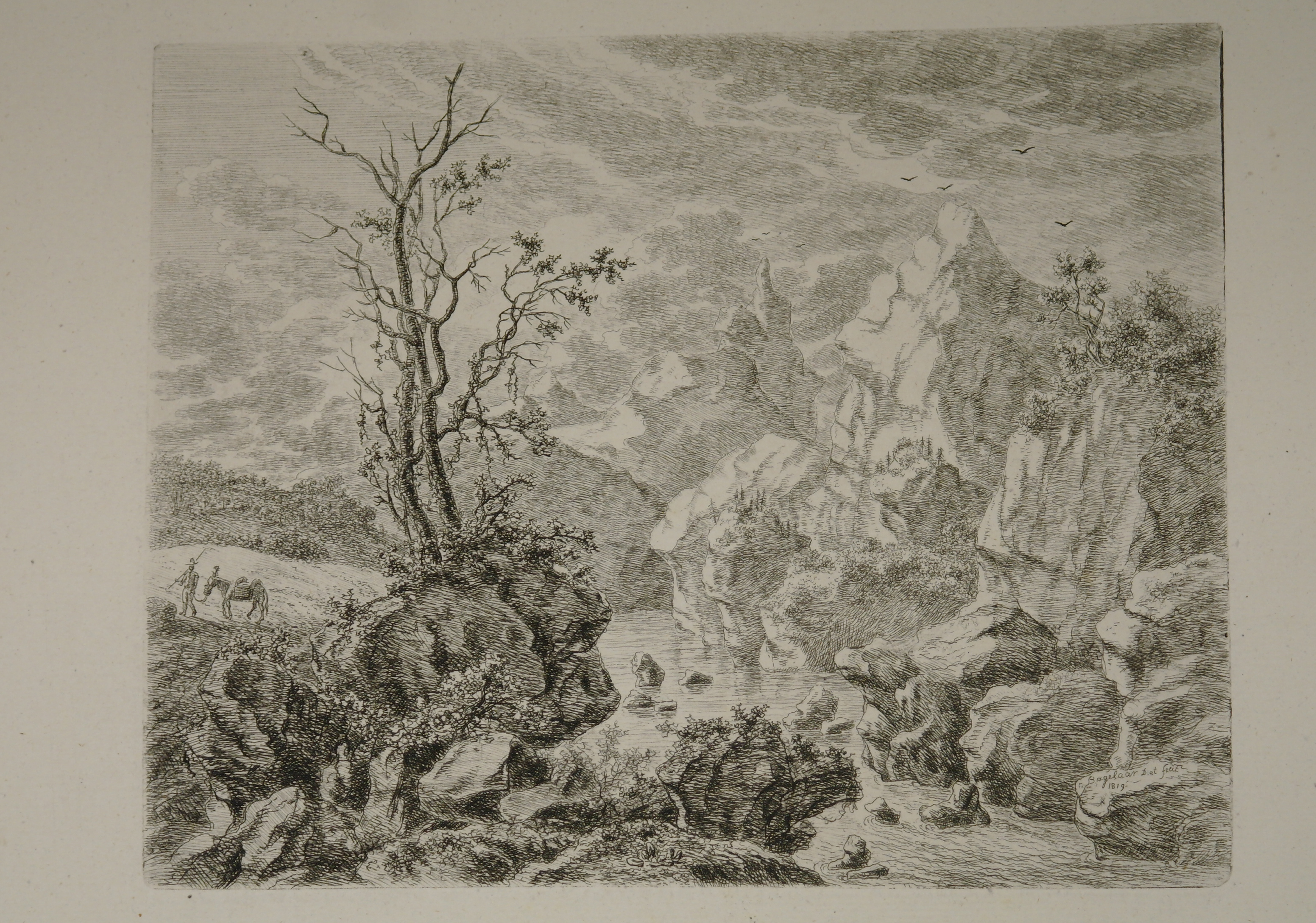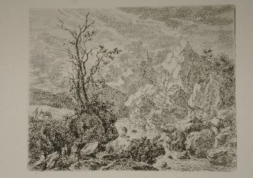 Tussen scherpe rotspunten loopt een rivier. gesigneerd en gedateerd r.o.: Bagelaar D. et. fecit. 1819. H&L (T. Hippert en J. Linnig) Le Peintre-graveur hollandais et belge du 19me siècle, 1879 nr. 147 op één vel samen met 1999.10.176 op achterzijde geen stempels