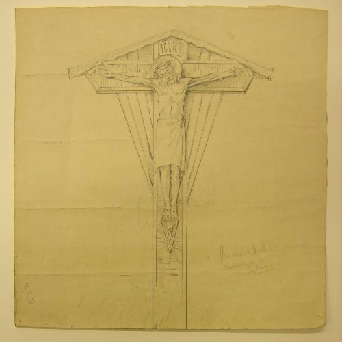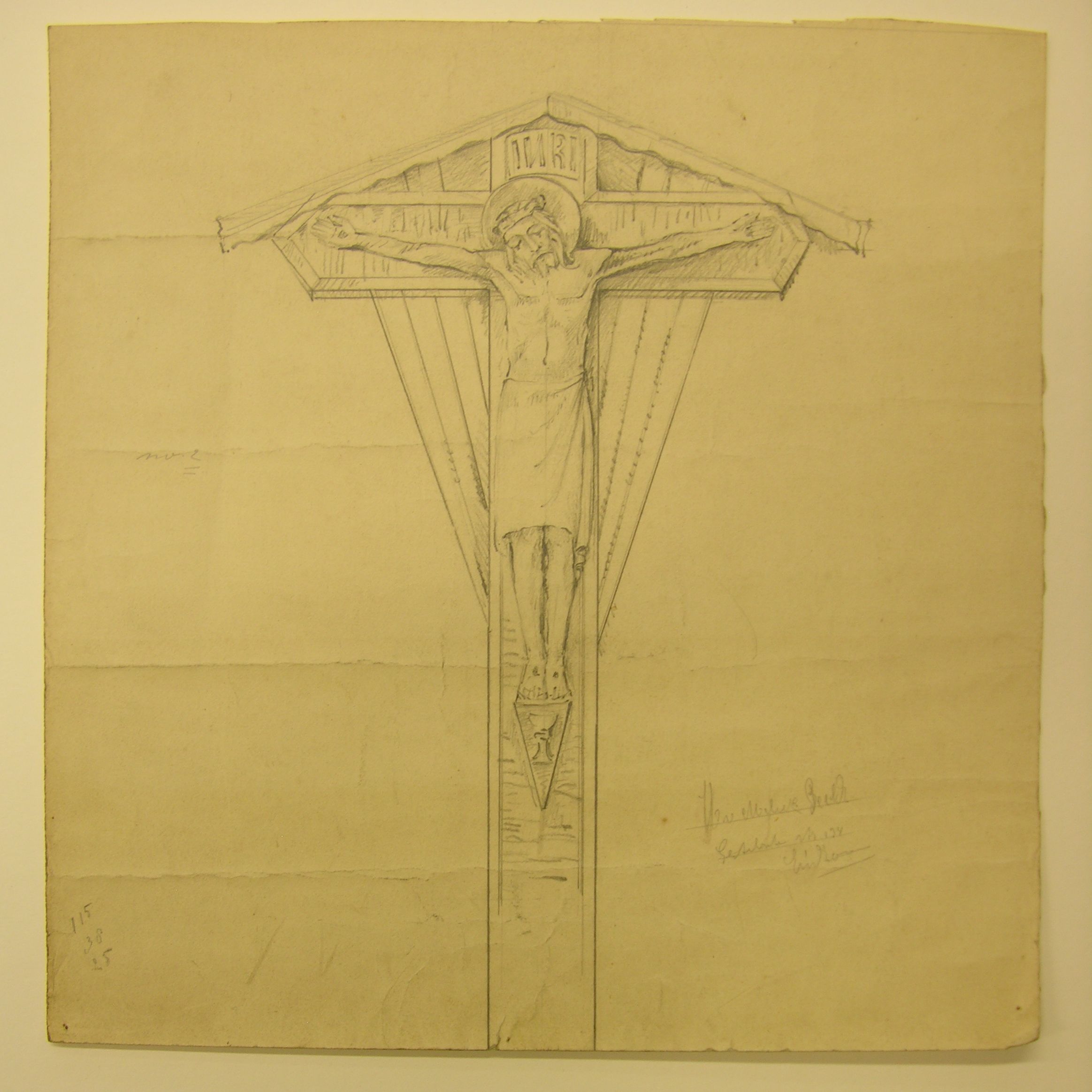 Christus aan kruis (grafbeeld) - z.j., potlood/papier, 314 x 307 mm, gesigneerd r.o.: H. v Melick Beeldh. Gestelschestr. 134 Eindhoven Gesigneerd r.o.: H. v Melick Beeldh. Gestelschestr. 134 Eindhoven. Hubert van Melick was, na beëindiging van atelier Custers in dienst van Matthijs Coolen