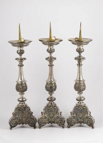Behorend tot een serie van zes kandelaars (1995.03.04 t/m 1995.03.09), inscriptie op twee van de afgeplatte hoeken: 'LAMB. VAN RYSWYCK FT. ANTV. 1879 Van Loon DDJL et E. Tacx conj.' Zilverwerk is afkomstig van de Congregatie der Zusters Franciscanessen, Koestraat 37 te Oirschot. (Zie ook dossier: CMC 1995.03.01 t/m 1995.03.15)