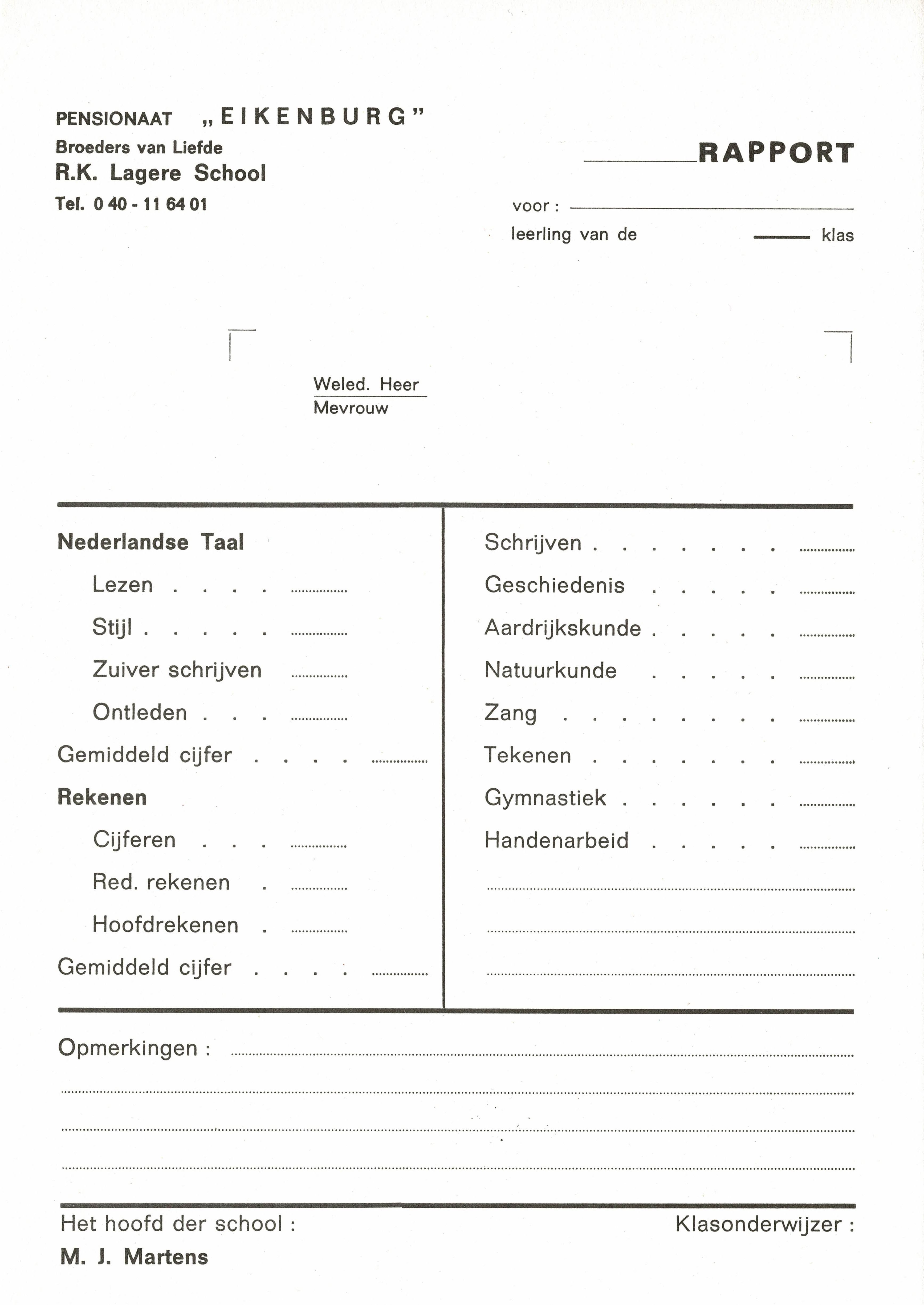 Rapport pensionaat Eikenburg voor leerling van R.K. lagere school