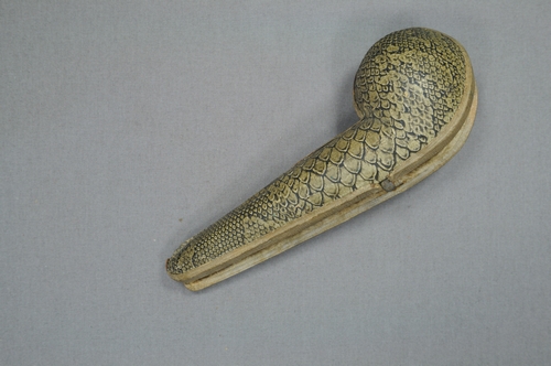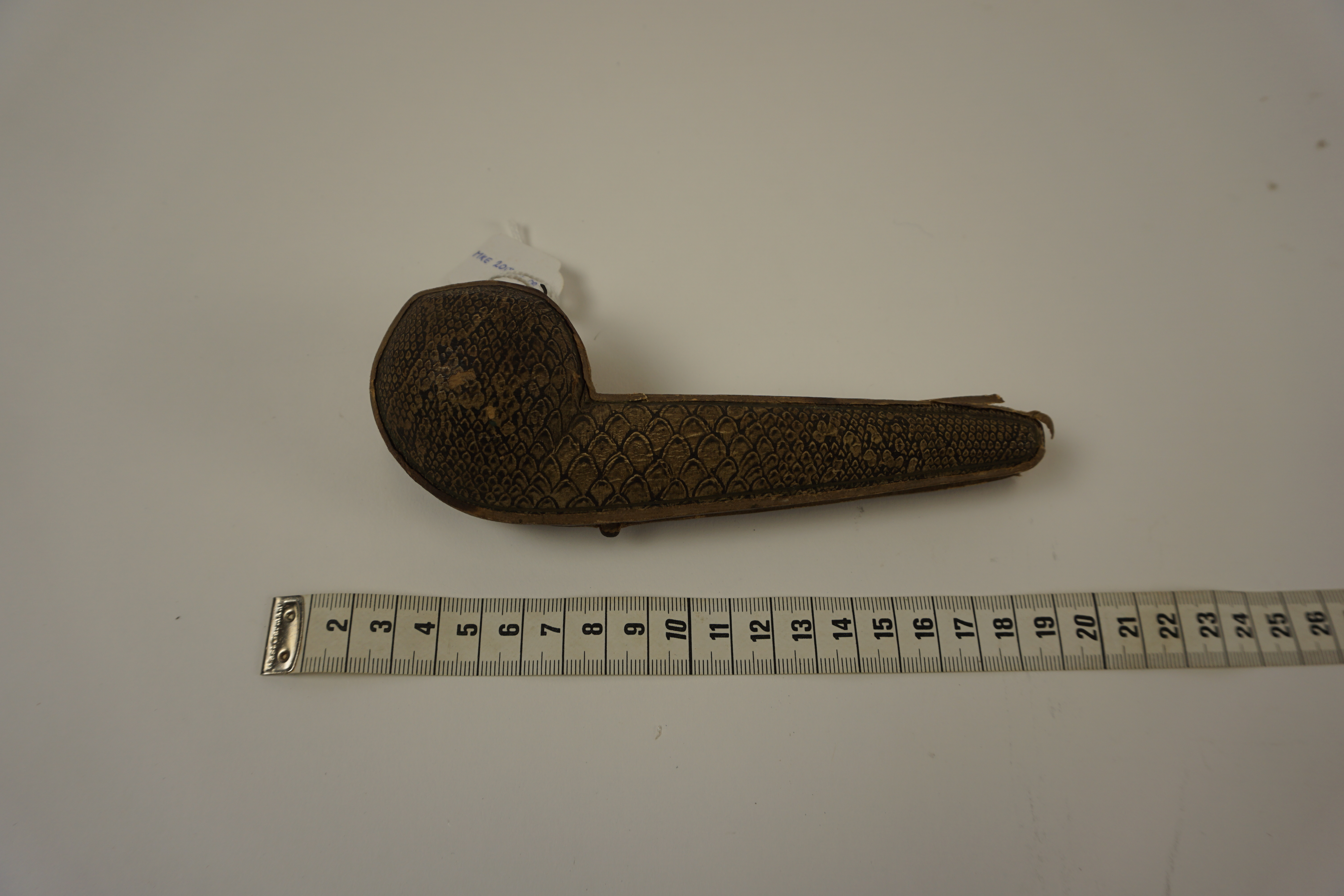Pijpehuls of pijpetui, materiaal: hout en pluche op katoen, kleur: beige/lederkleur, scharnierende rigide (harde) pijpenhuls vervaardigd van met karton of papier-maché bekleed hout in de vorm van een bruyère pijp met korte steel, op de buitenzijde een opdruk van namaak krokodillenleeer, aan de binnenzijde een voering van pluche, lengte 16 cm, hoogte 5,7 cm Pijpehuls komt ...