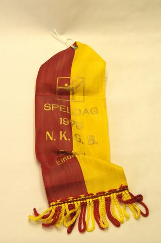 Vaantje Speldag NKGB District Eindhoven – 1978, materiaal: kunstzijde, afmetingen: 24,5 x 7,5 cm, rood/geel verticaal gebaand vaantje met onderaan rood/gele franjerand en bovenaan gedrukte punt, met in vergulde letters de opdruk: ‘Speldag 1978 NKGB Distrikt Eindhoven’, geheel bovenaan een afbeelding van een geabstraheerde turnster