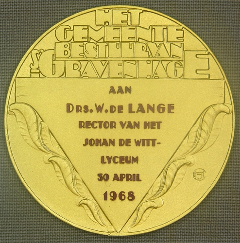 Bronzen slagpenning; De gemeentepenning van de stad 's-Gravenhage. Voorzijde: Gemeentewapen van 's-Gravenhage (een bekroond wapenschild waarop ooievaar met slang in de bek staat) aan weerszijden geflankeerd door twee lions rampants. Keerzijde: Bovenaan reliëfopschrift in art deco belettering 'HET GEMEENTEBESTUUR VAN 'S-GRAVENHAGE', daaronder driehoekig veld voor tennaamstelling van de begunstigde, met ingegraveerd opschrift 'Aan Drs. W. ...