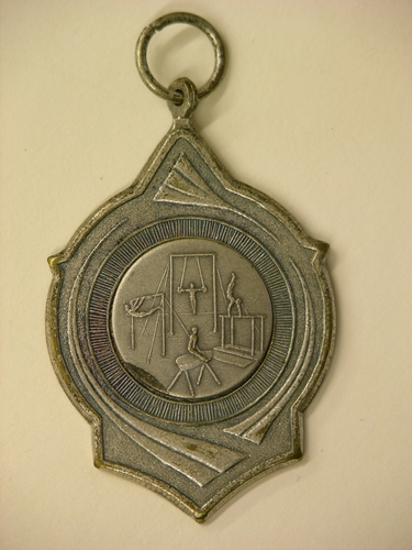 Draagmedaille/prijspenning doorboord ringetje met open draagringetje. In de basis ronde vorm met boven en onder puntige verlenging, evenals (in afgeslankte vorm) links en rechts boven het midden. Recto: centraal circelvormig vsld met in reliëf een afbeelding van vier sportende personen, bezig met diverse turnoefeningen. Verso: inschrift 'M D '86 M 12-15 J'
