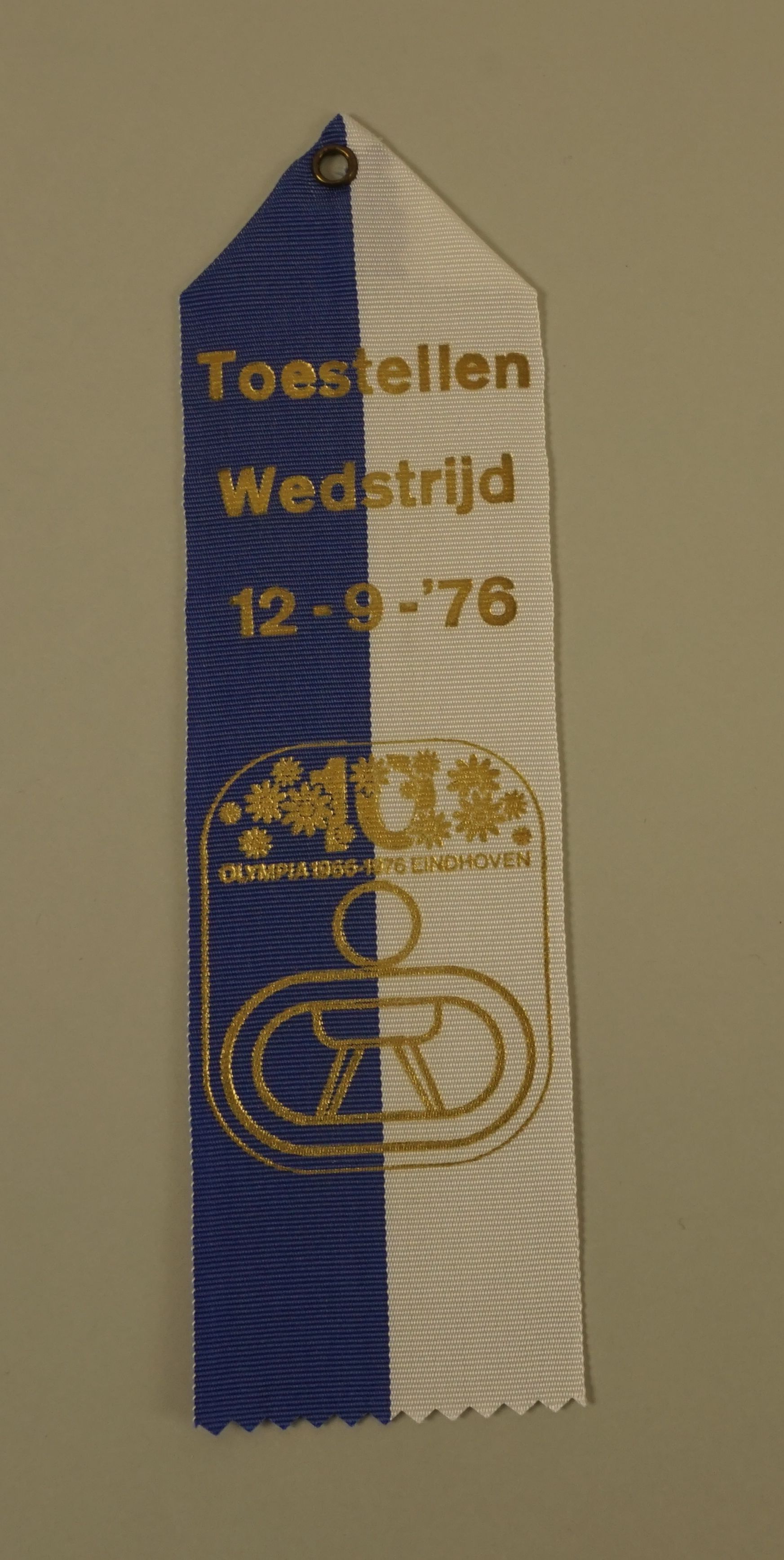 kleur: blauw/wit met goud opdruk: Toestellen wedstrijd 12-9-'76 10e Olympia 1966-1976 Eindhoven boven in punt gevouwen met metalen oog alle in speciaal zakje verpakt: het medaillehuis Groningen