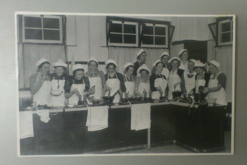 Foto van kokende vrouwen. De vrouwen staan samen aan een L-vormig fornuis. Ze dragen allen een witte muts en een wit schort. Op achterzijde geschreven: "1938" en "B9247". De kookcursus werd door Philips cadeau gedaan aan mevr. A. Josiassen voor haar aanstaande huwelijk. Moeder (Adrienne Virginie Josiassen) is met 17 jaar van Hulst naar Eindhoven gekomen. ...