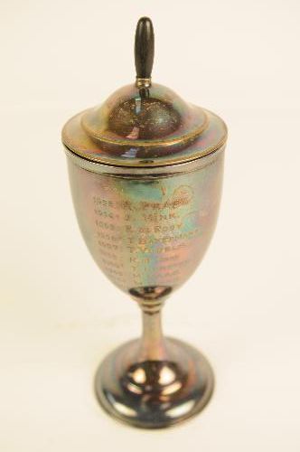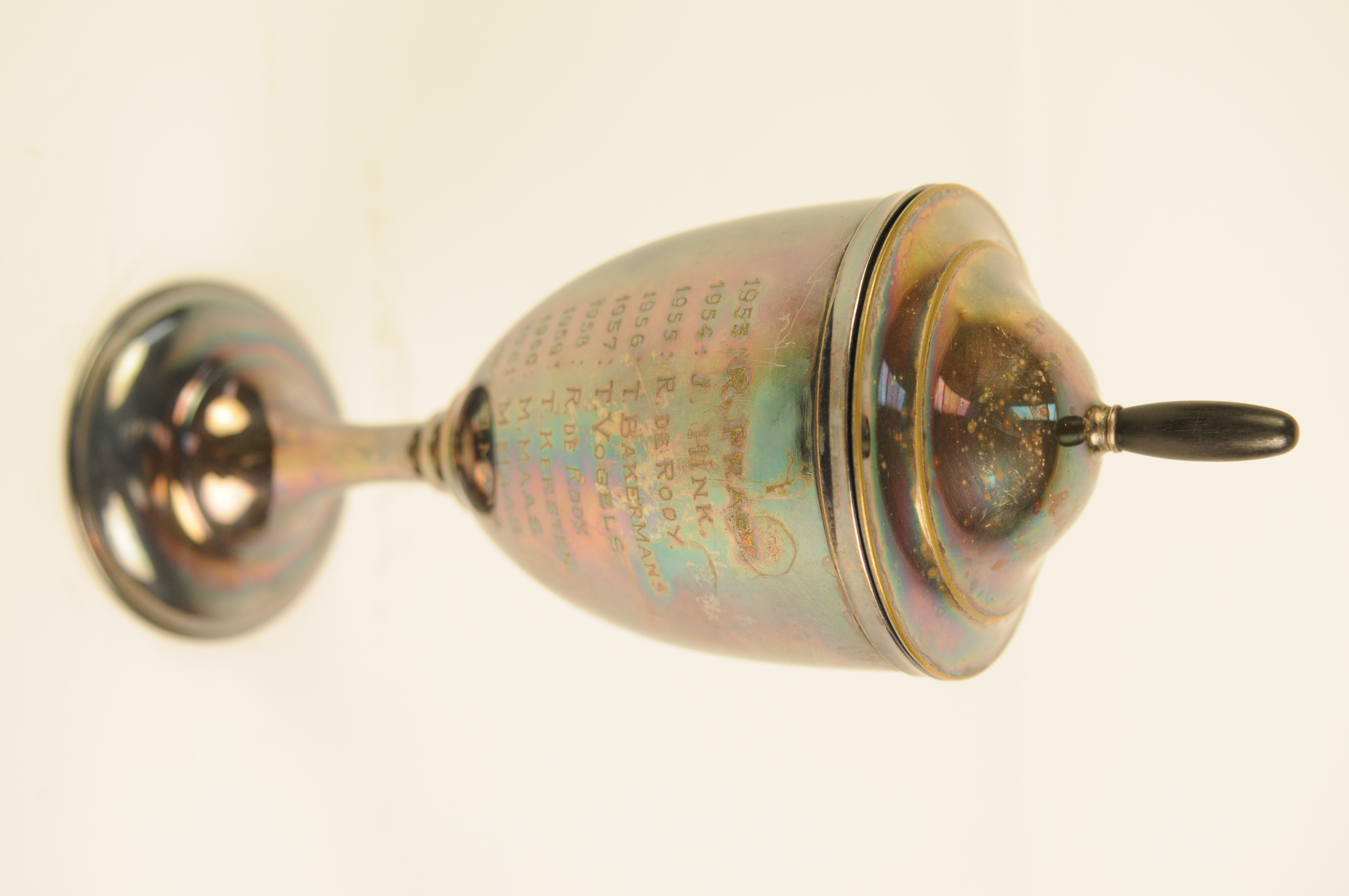 Prijsbeker met deksel – 1946, met de inscriptie: ‘Onderlinge Wedstrijd / O.B.C. / Dames 1e graad / 1946 D. Frencken / 1947 J. Iking / 1948 J. Iking / 1949 N. Renders / 1950 A. Baaijens / 1951 A. Schoenmakers A. Baaijens / 1952 A. Baaijens / 1953 R. Pragt / 1954 J. Hink / ...