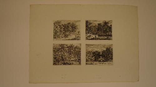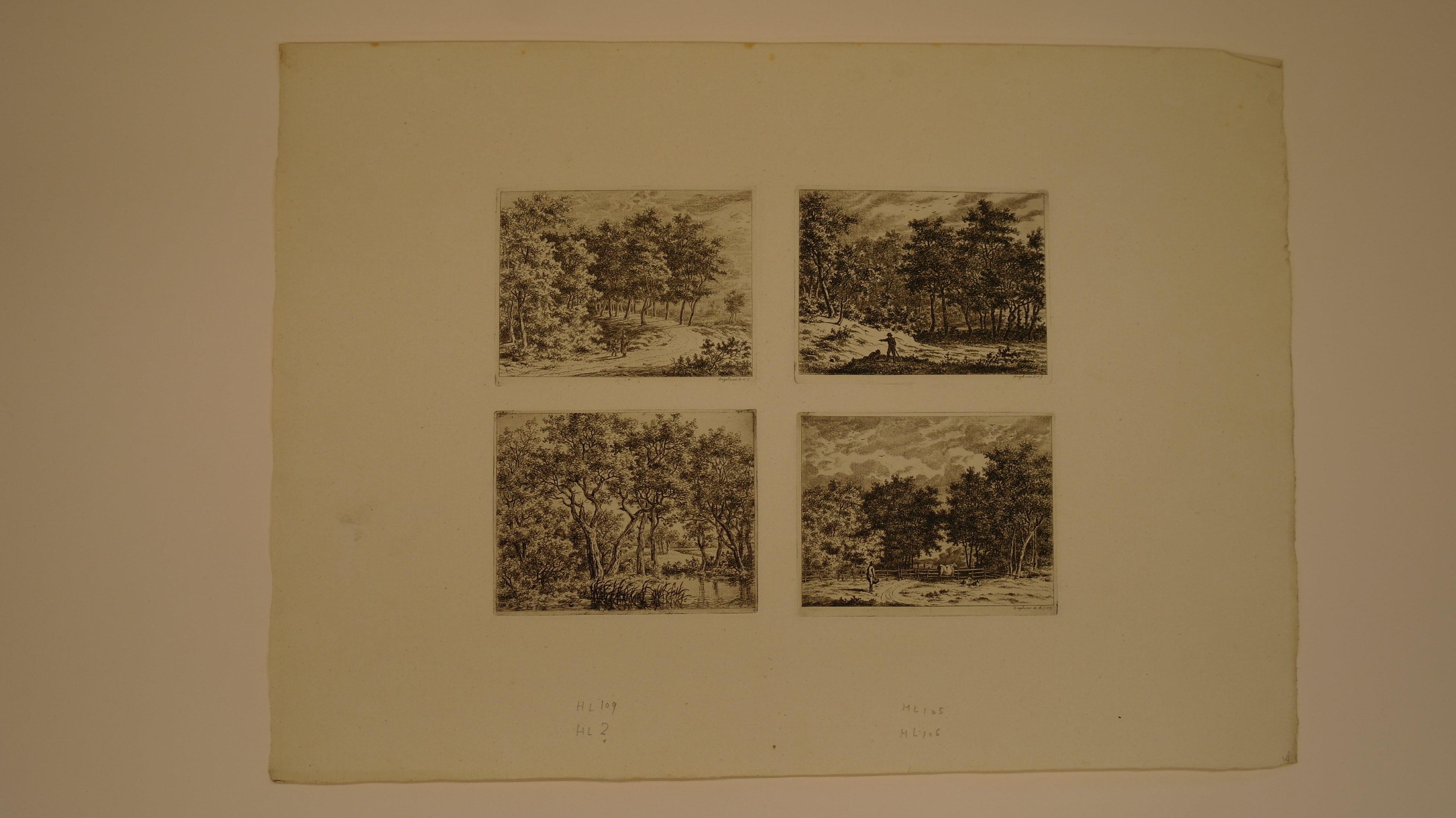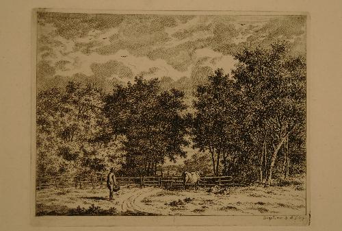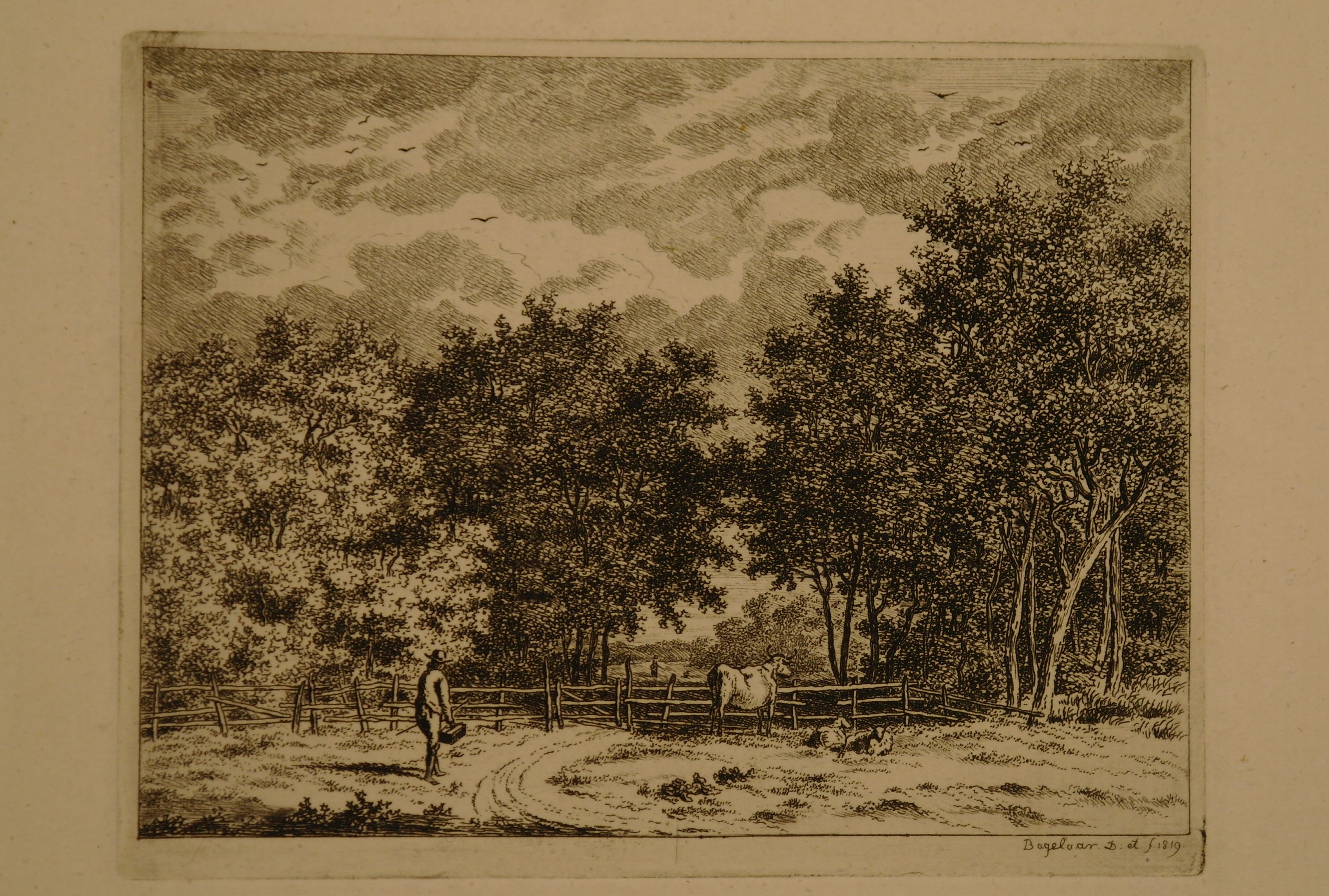 Een koe en twee schapen staan voor het hek van een wei in het bos. Een man met een mandje gaat er naar toe. gesigneerd en gedateerd r.o.: Bagelaar D. et f. 1819 H&L (T. Hippert en J. Linnig) Le Peintre-graveur hollandais et belge du 19me siècle, 1879 nr. 106 op één vel samen met 1999.10.119, ...